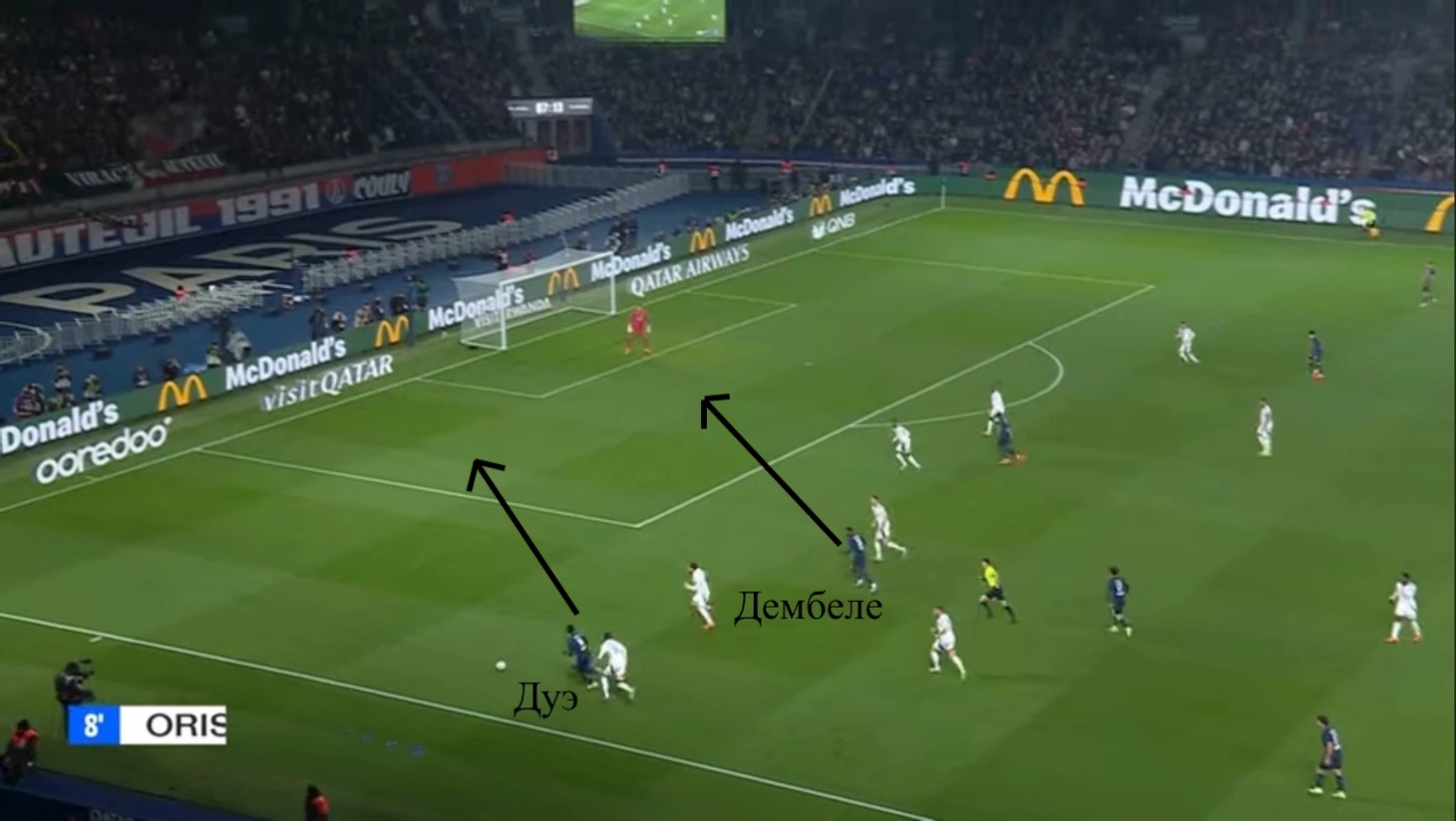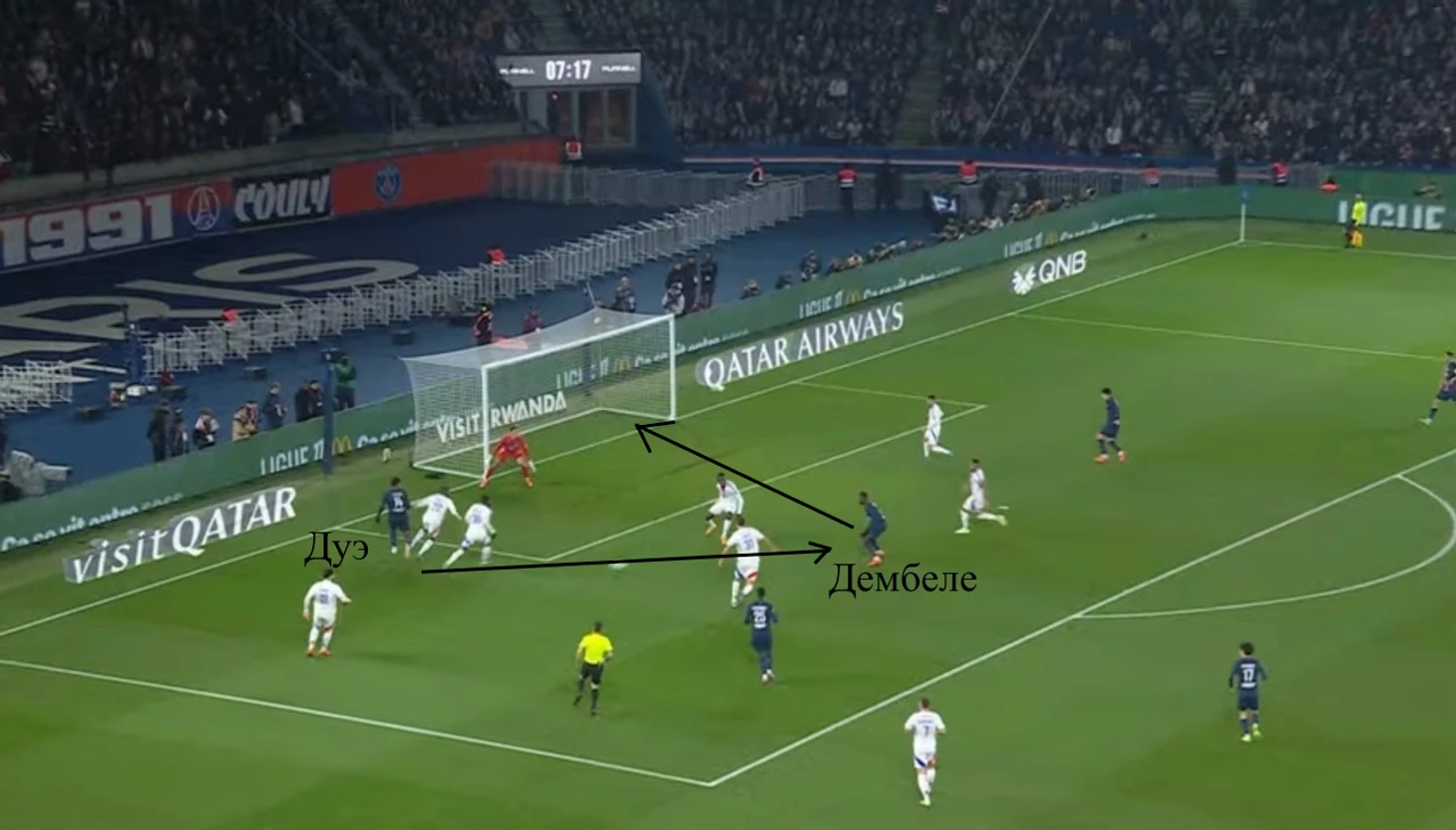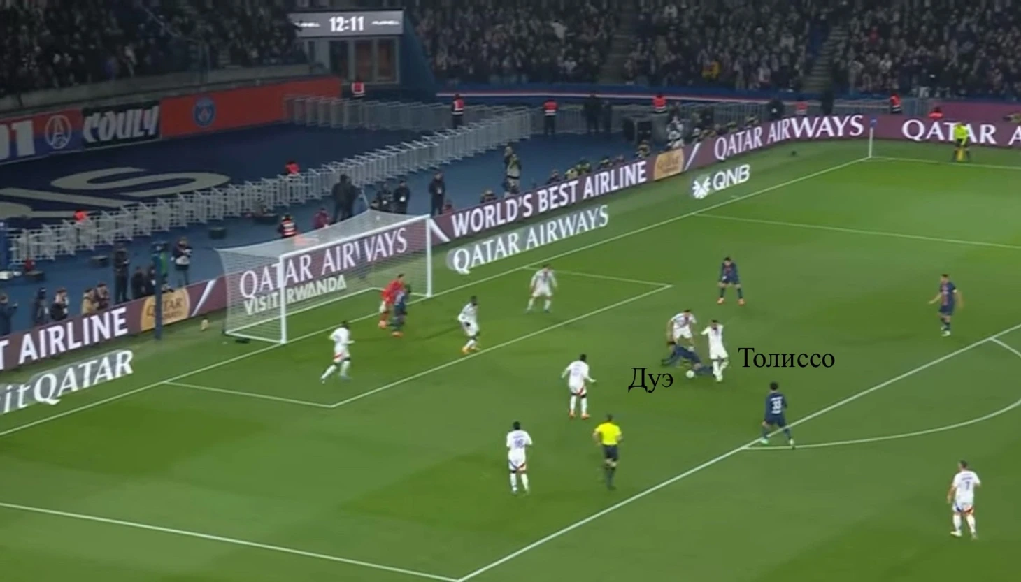 На 13-ой минуте матча «хозяева» разыгрывают аналогичную атаку через левый фланг. От Дембеле слева следует пас в центр штрафной, где мяч принимает Дуэ. Неудачный отбор центрального полузащитника «Лиона» Толиссо (Рисунок 3) приводит к назначению пенальти. Витинья становится на точку и уверенно реализует удар (Рисунок 4). 2:0!