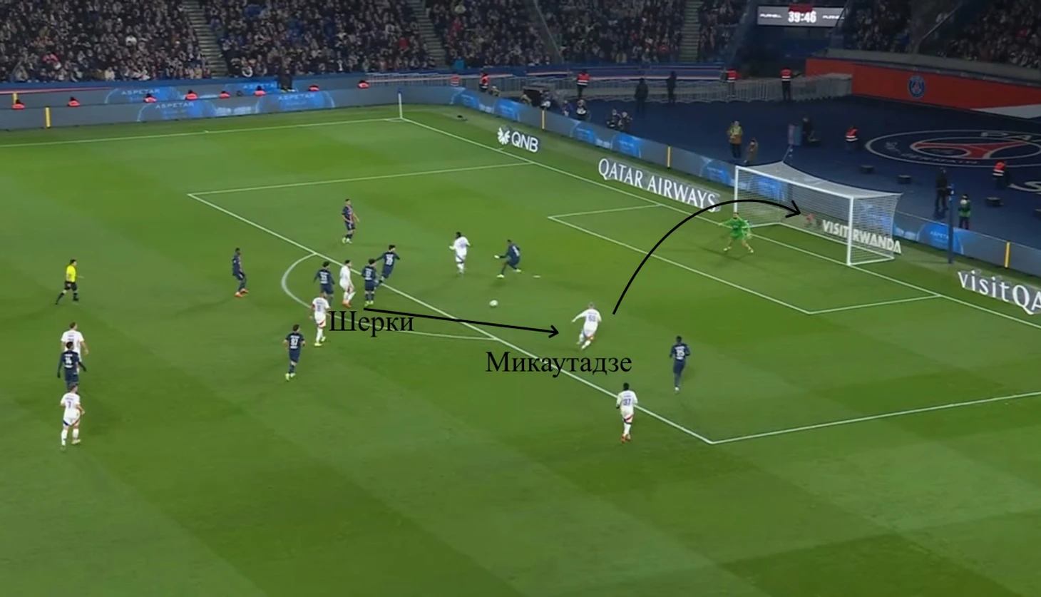 На 40-ой минуте матча, ошибка «парижан» приводит к единственному забитому голу «Лиона». Благодаря быстрым действиям в финальной трети поля игроков «Лиона», «парижане» не успевают перестроиться в низкий блок. В штрафной площади «парижан» образуется свободное пространство, которым воспользовался нападающий «Лиона» и сборной Грузии – Жорж Микаутадзе (Рисунок 5). 2:1!