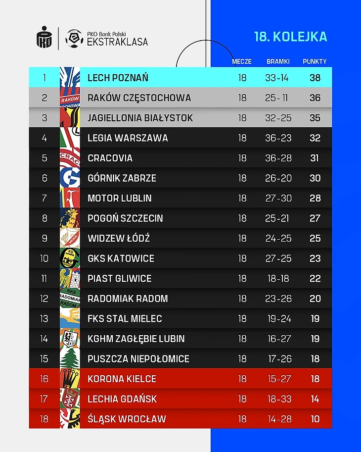 Польская Экстракласа ушла на паузу. Сегодня кратко подведем итоги первой половины сезона, разберемся, как «Лех» вернулся на первую строчку чемпионата, а серебряный призер прошлого сезона замыкает турнирную таблицу.