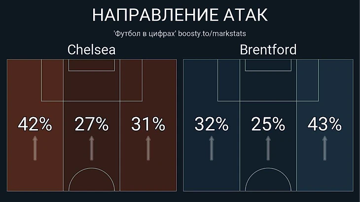 Но из-за оборонительной структуры гостей и перегруза атакующей линии, проводить атаки через центр поля было крайне проблематично, поэтому «Челси» прибегнул к игре в обоих полуфлангах, либо навесам в штрафную. Наглядно это показано в графике направления атак.