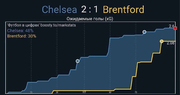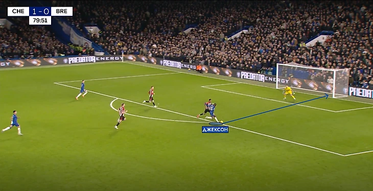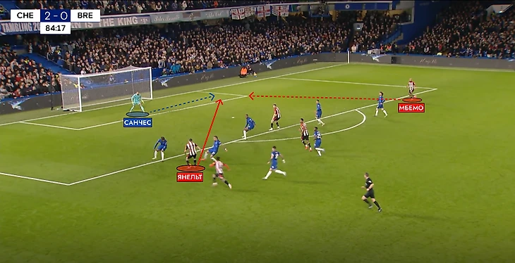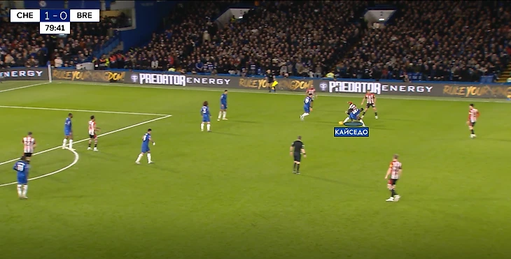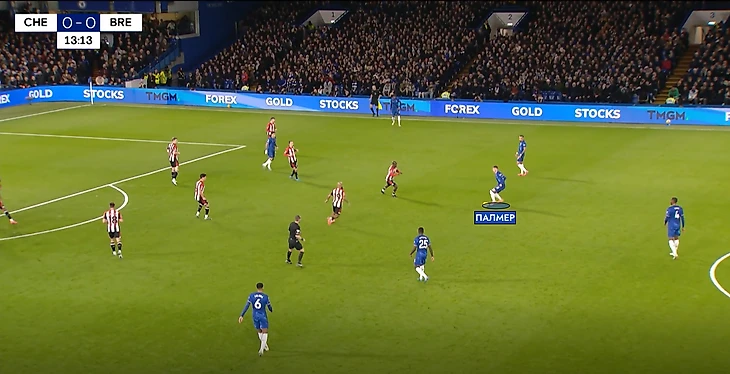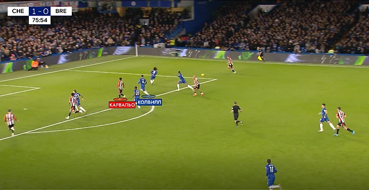 Не скажу, что перегруз в атакующей линии сильно помогал, но пару моментов футболисты «Челси» создать из этой идеи смогли. Игроки «Брентфорда» оставляли за собой большие разрывы между собой, либо отвлекались на других футболистов.