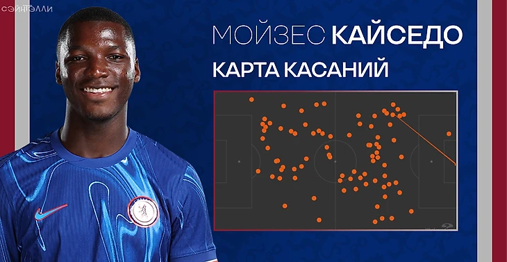Удачная реализация идеи с перегрузом в атаке не была бы возможна без отличной игры от Мойзеса Кайседо – помимо того, что он оставался одним номинальным опорником, эквадорец был важен в построении позиционной атаки – 56 точных передач из 65 попыток, из которых 12 были сделаны из трети соперника. Мои отлично сыграл в защите, выдав 6 отборов, и по карте касаний ниже, кажется, что Кайседо в прошедшем матче был абсолютно везде.