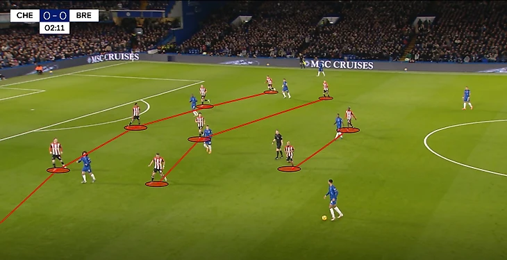 Таким образом, у «синих» привычная позиционная структура «3-2-5» образовалась в «3-1-6», с явным перекосом в финальную треть. Во время позиционной атаки в опорной зоне оставался один Кайседо – такой ход делался не случайно, ведь «Бренфторд» в позиционной обороне занимался больше выжиданием ошибок со стороны хозяев, чем прессингом и попыткой быстро перехватить мяч.