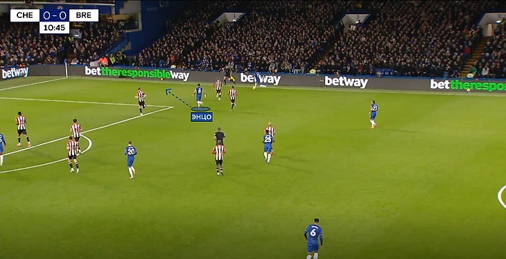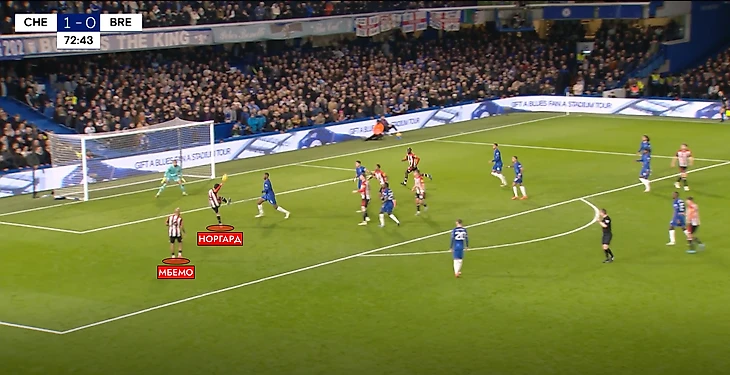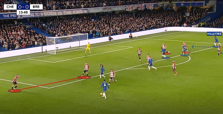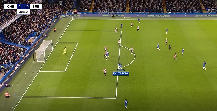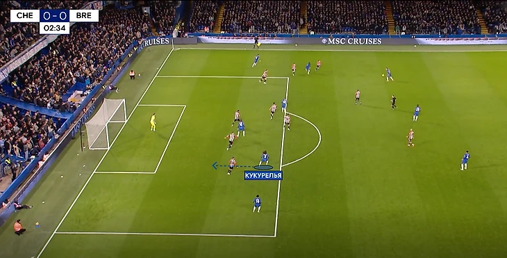 В этом матче Марк получил инвертированную роль, поднимаясь с позиции фуллбека на «восьмерку/десятку» с постоянным подключением в штрафную. Цель ясна – высокая позиция Кукурельи давала плюс одного человека в штрафной, что позволяло «Челси» распылять внимание защитников «Брентфорда», и повышать шанс на результативный итог атаки.
