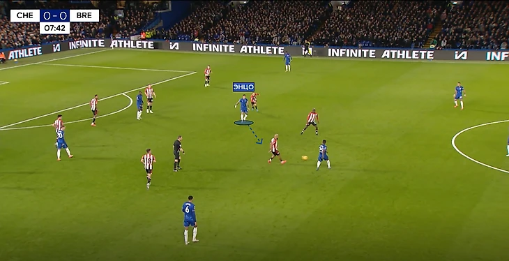 Однако, против пятерки защитников соперника, «Челси» еще сильнее нагружал финальную треть, дополнительно подключая одного игрока в атаку. Этим игроком стал Энцо, который лавировал между двумя линиями, выдергивал за собой своих опекунов.