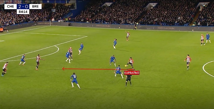 Даже после второго пропущенного, гости все равно продолжили пытаться убегать в быстрые контратаки, а со свежими игроками им это удавалось куда лучше, чем по ходу всей игры. К тому же, «Челси» продолжал проседать в обороне, проигрывая на втором этаже. Карвальо удалось подобрать мяч и продолжить атаку.