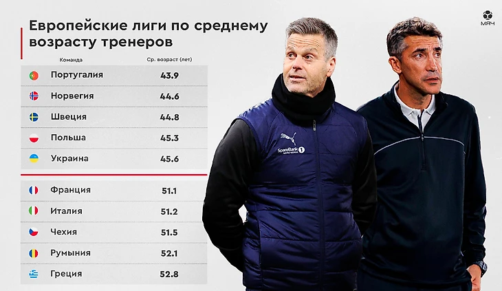 В Англии тоже любят молодых – средний возраст наставников в Премьер-лиге составляет 46.5. Там три тренера младше 40 лет. Кстати, это единственный топ-чемпионат, в котором сейчас вообще не работают коучи старше 60 лет. Самый возрастной – Ангелос Постекоглу (59).