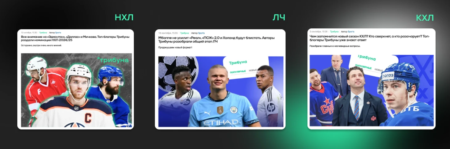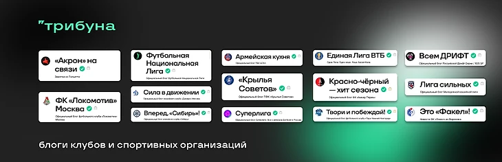 Трибуна – площадка для контента о спорте. И часто на ней рассказывают о спорте именно те, кто этот спорт создает: клубы, федерации, лиги. Мы особенно радуемся, когда к нам приходят индустриальные игроки, и стараемся помогать им раскрываться для болельщиков с другой стороны. В этом году к нам присоединились футбольные и хоккейные клубы, вот некоторые из них: