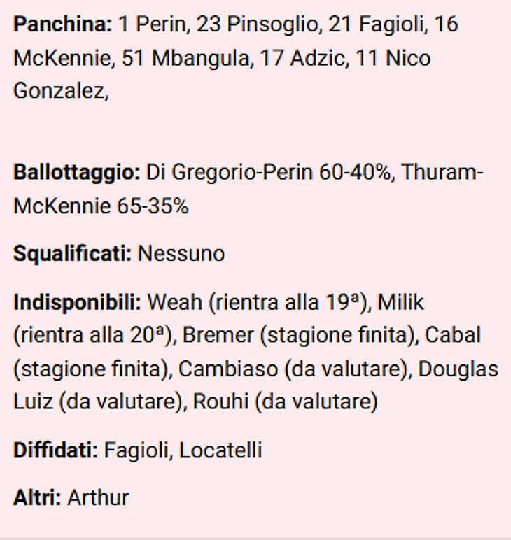 Замены. Как видим, реально усилить игру смогут Фаджоли, МакКенни, Мбангула и Нико. Существует вероятность, что место в воротах займет Перин, а пару Локателли в центре полузащиты составит МакКенни.