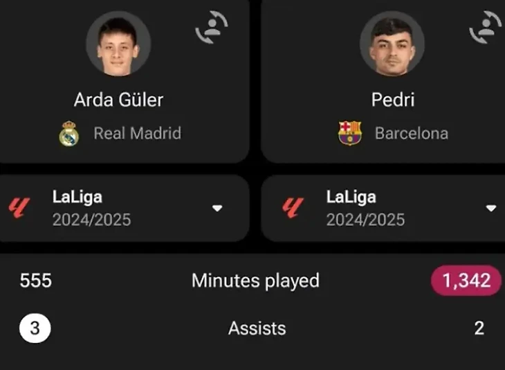 Фанат «Реала» решил сравнить количество минут на поле и ассистов у Педри из «Барсы» и Арды Гюлера из «Реала».