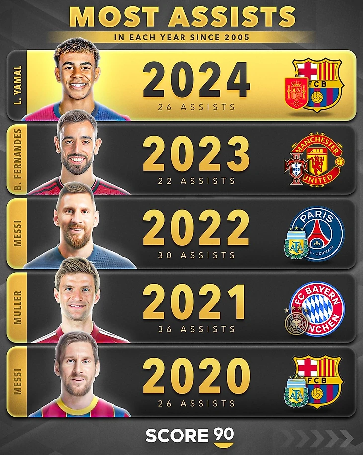 🤯 Ламин Ямаль отдал наибольшее количество голевых в 2024 году! Вспоминаем лучших ассистентов с 2005 года по наши дни