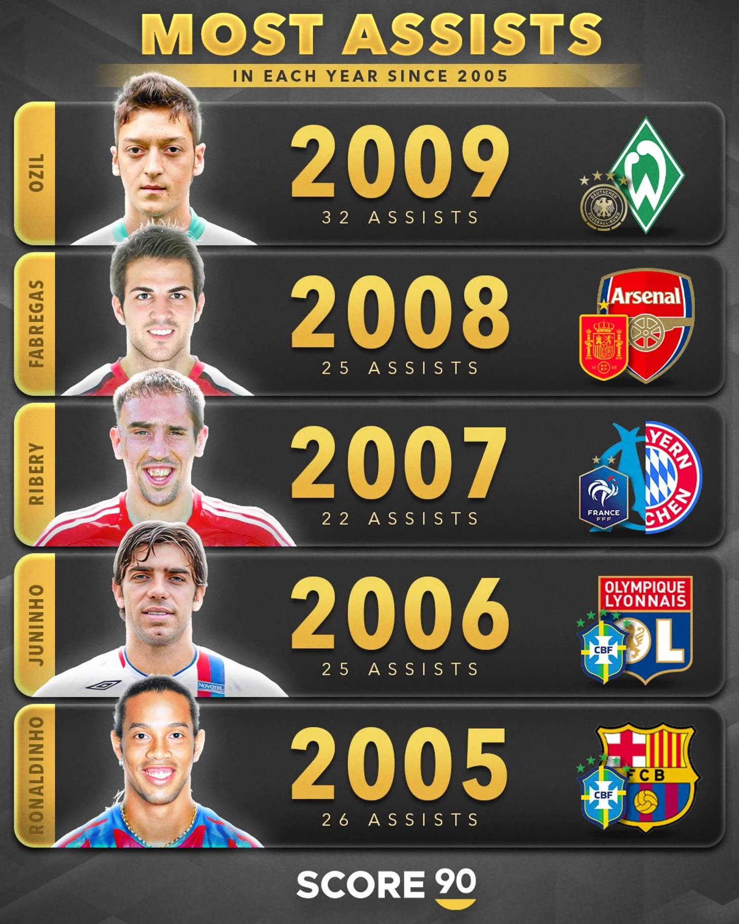 Портал Score90 вспомнил, кто из футболистов отдавал наибольшее количество голевых с 2005 по 2024 год. В списке доминирует Лионель Месси, аргентинец становился лучшим ассистентом года пять раз. На втором месте оказался Месут Озил, он трижды оказывался лучшим по голевым за календарный год.