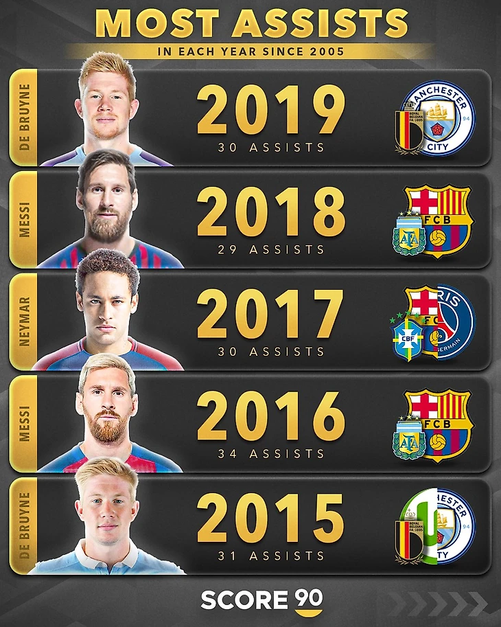 Лучшие ассистенты топовых лиг с 2005 по 2024 год