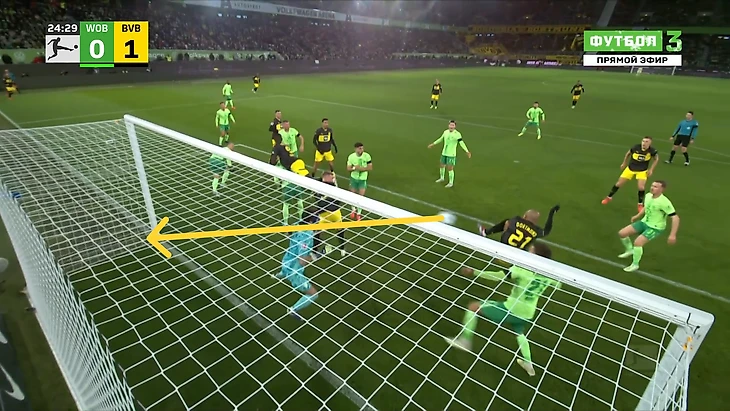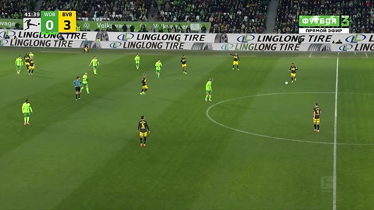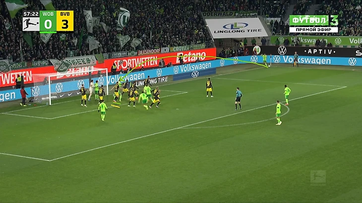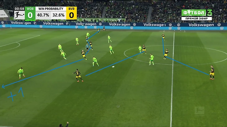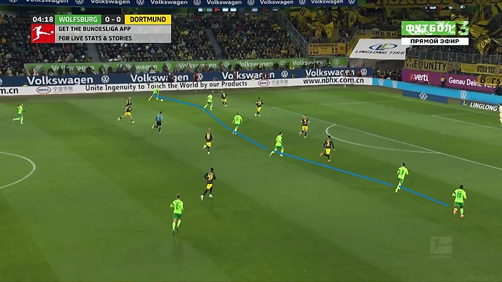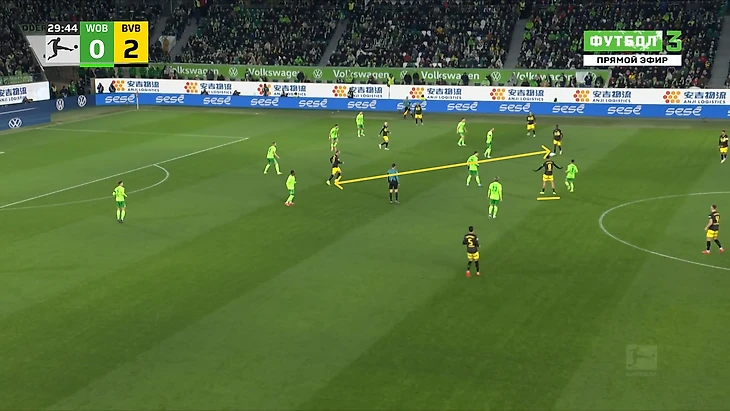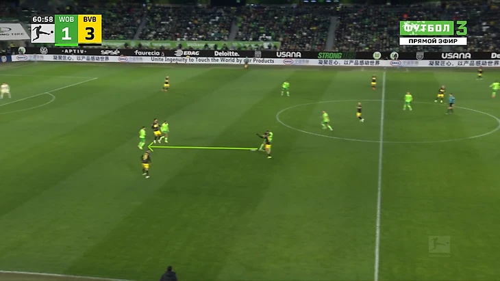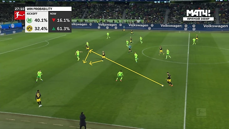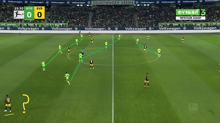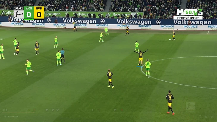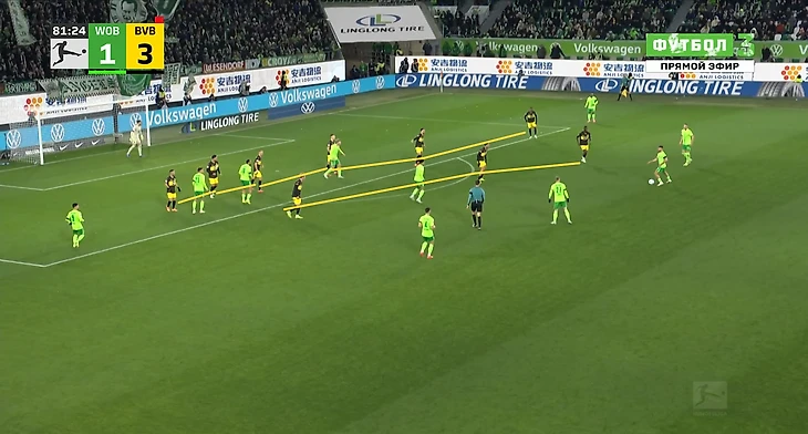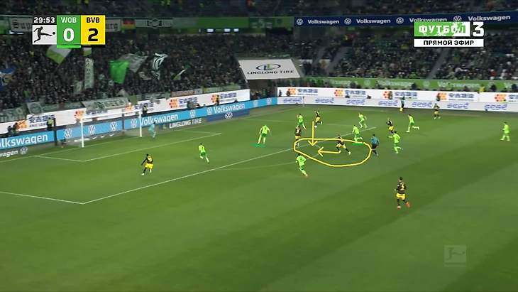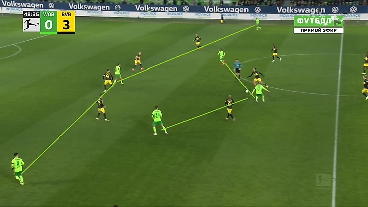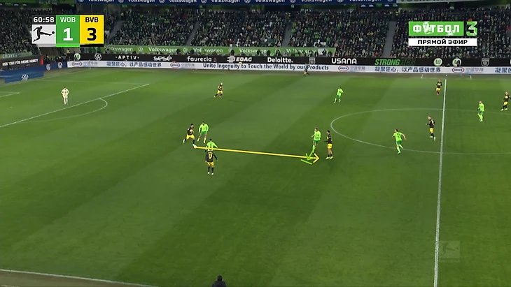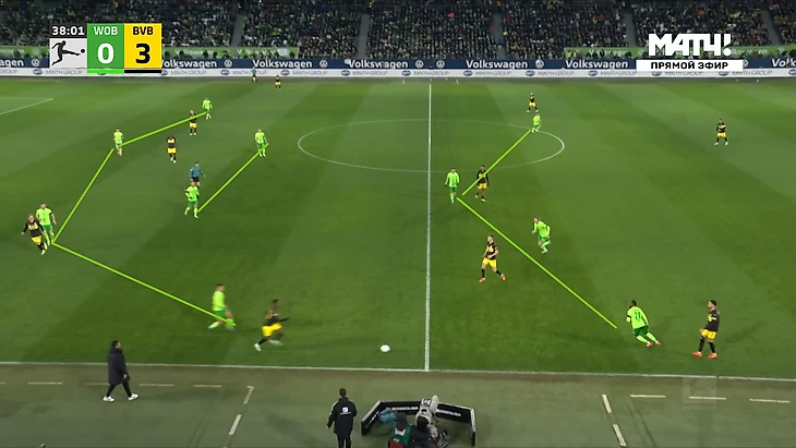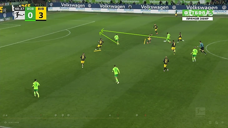 Да-да, вам не показалось, «Боруссия», не выигравшая ни одного матча в гостях в сезоне Бундеслиги, вышла играть против команды с 1 поражением в 9 последних матчах по схеме 3-2-5 на мяче. И на самом деле, отсутствие этой закомплексованности при игре на чужом поле, бенефисом которого стал матч с Гладбахом, где «шмели» во многом не проиграли, потому что и Сеоане вывел команду с настроем на ничью, стало краеугольным камнем в успехе Дортмунда сегодня, и помимо улучшения чисто командных взаимодействий, Шахин продемонстрировал еще и работу над ошибками в ментальном плане, в том числе и у себя. Тот самый, единственный голевой момент за первые 10 минут, кстати, пришел уже с первой атаки, вовремя которой скрин и был сделан. Очевидно, «Вольфсбург» сразу немного опешил, что не могло не сказаться на дальнейших событиях. Также, гости не стали менять свои постулаты прессинга и выставили все те же первые 2 линии в самую активную его фазу, с тем лишь отличием, что сегодня там было на одного игрока больше. И да, «шмели» не меняли модель прессинга вплоть до конца тайма, даже при 0-3.