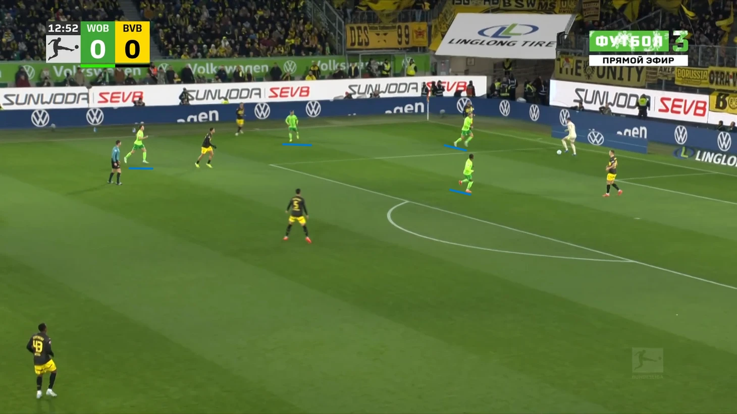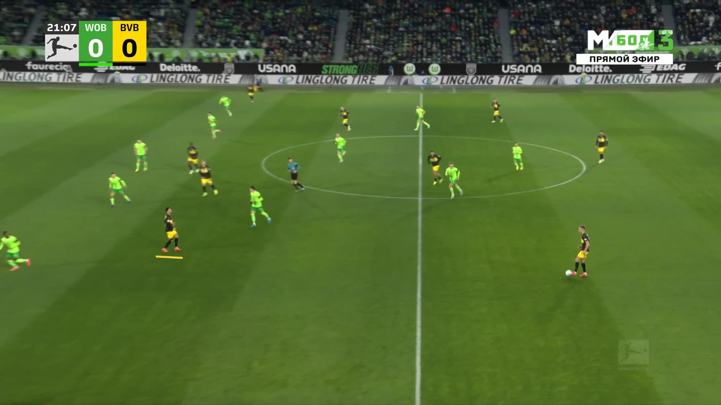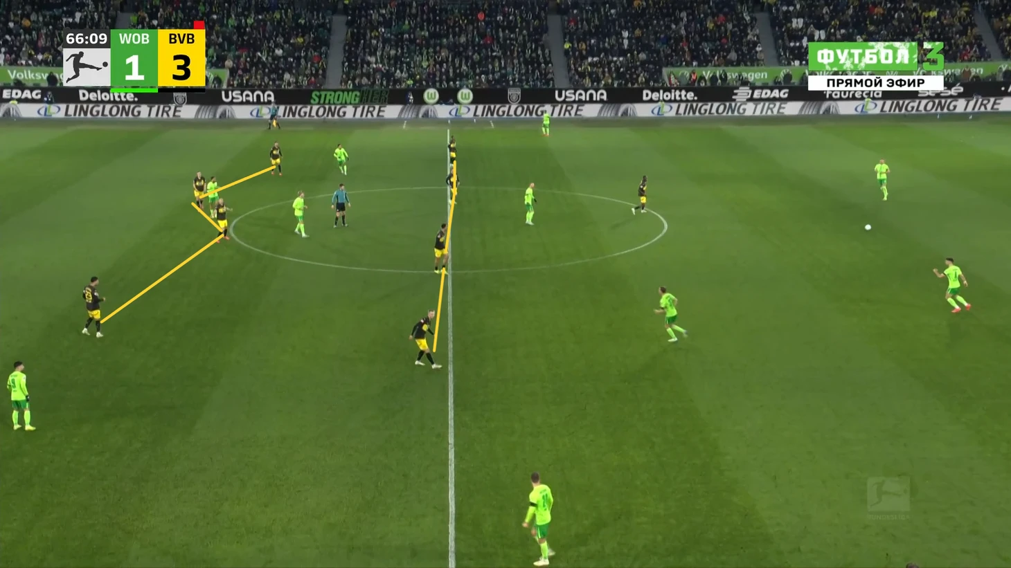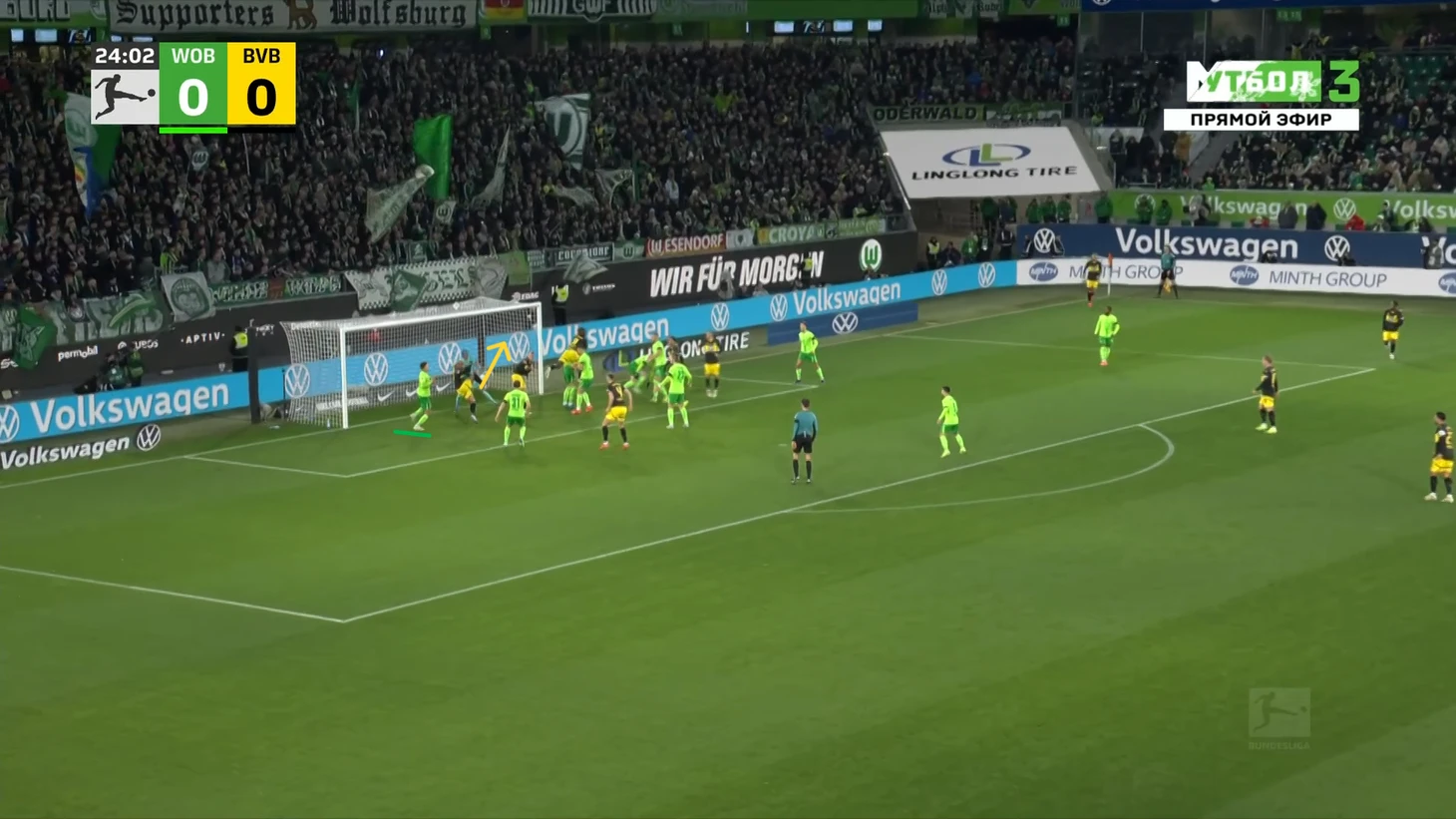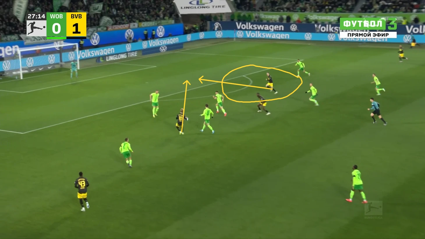 Да-да, вам не показалось, «Боруссия», не выигравшая ни одного матча в гостях в сезоне Бундеслиги, вышла играть против команды с 1 поражением в 9 последних матчах по схеме 3-2-5 на мяче. И на самом деле, отсутствие этой закомплексованности при игре на чужом поле, бенефисом которого стал матч с Гладбахом, где «шмели» во многом не проиграли, потому что и Сеоане вывел команду с настроем на ничью, стало краеугольным камнем в успехе Дортмунда сегодня, и помимо улучшения чисто командных взаимодействий, Шахин продемонстрировал еще и работу над ошибками в ментальном плане, в том числе и у себя. Тот самый, единственный голевой момент за первые 10 минут, кстати, пришел уже с первой атаки, вовремя которой скрин и был сделан. Очевидно, «Вольфсбург» сразу немного опешил, что не могло не сказаться на дальнейших событиях. Также, гости не стали менять свои постулаты прессинга и выставили все те же первые 2 линии в самую активную его фазу, с тем лишь отличием, что сегодня там было на одного игрока больше. И да, «шмели» не меняли модель прессинга вплоть до конца тайма, даже при 0-3.