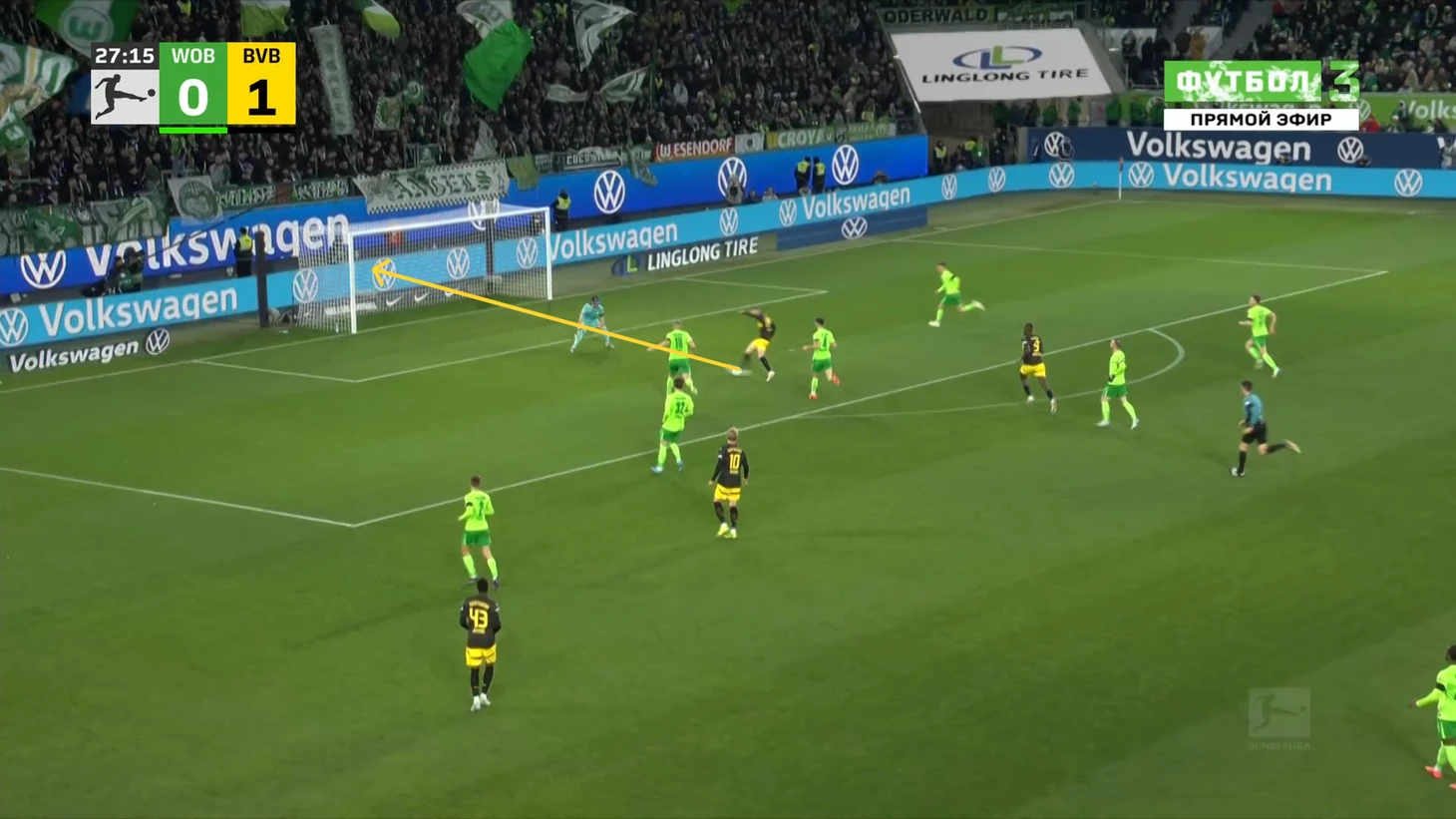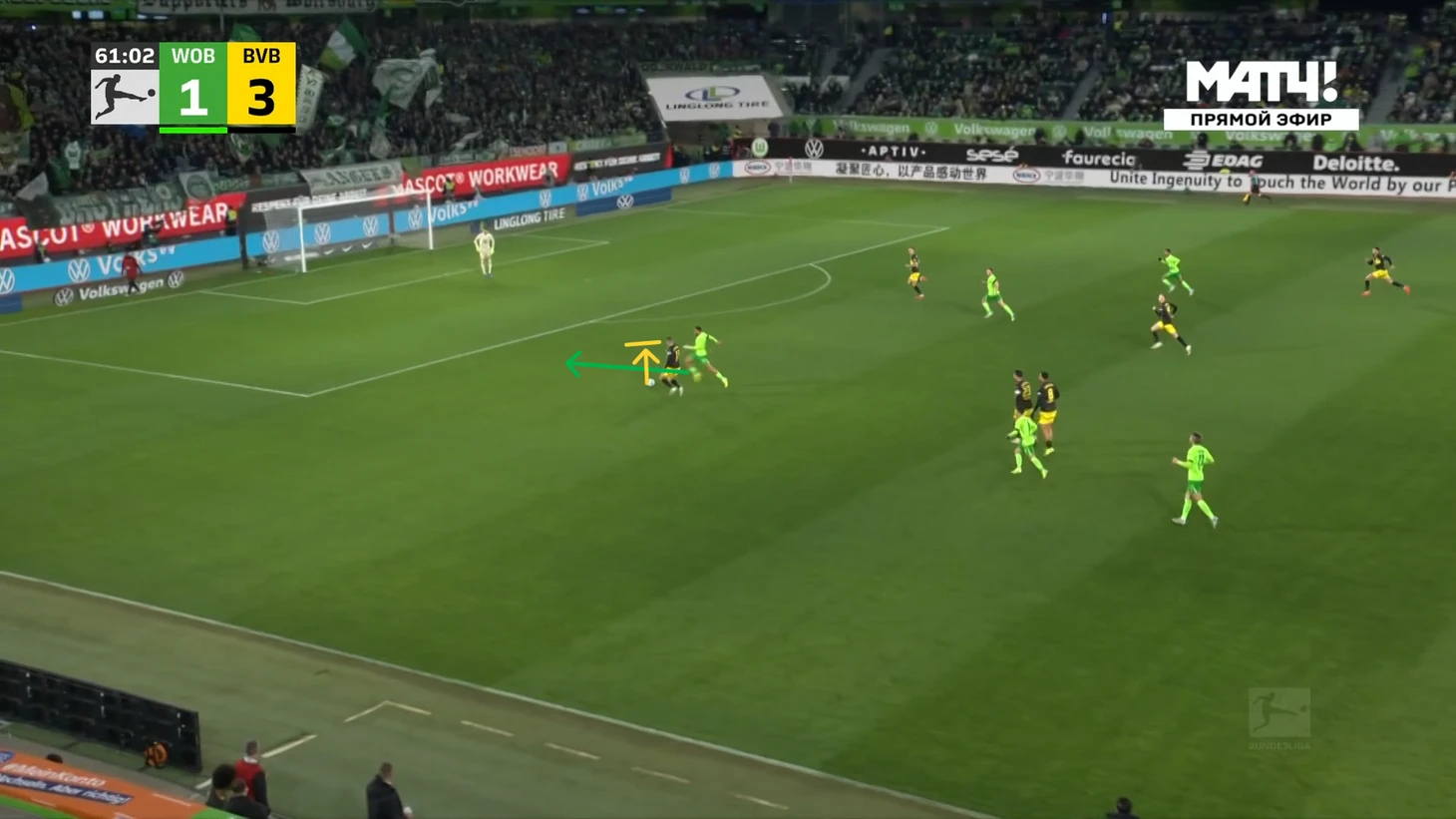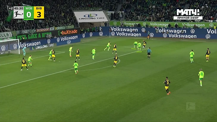 У Эмре ощутимо больше передач, но по точности они даже хуже, чем у Шлоттербека, хотя пасы Нико куда более рискованные, что подтверждает их ожидаемая опасность. Собственно, именно одна из неточных передач Эмре знатно подкосила Дортмунд и заставила его сидеть почти безвылазно сидеть в обороне большую часть второго тайма. Немного скажу и о «Вольфсбурге», ведь с начала казалось, что матч будет максимально равным и сумасшедшим. Ну а какие еще предположения могли возникнуть после вышеописанного начала от «шмелей», а затем и от «волков»? Просто взгляните на это: