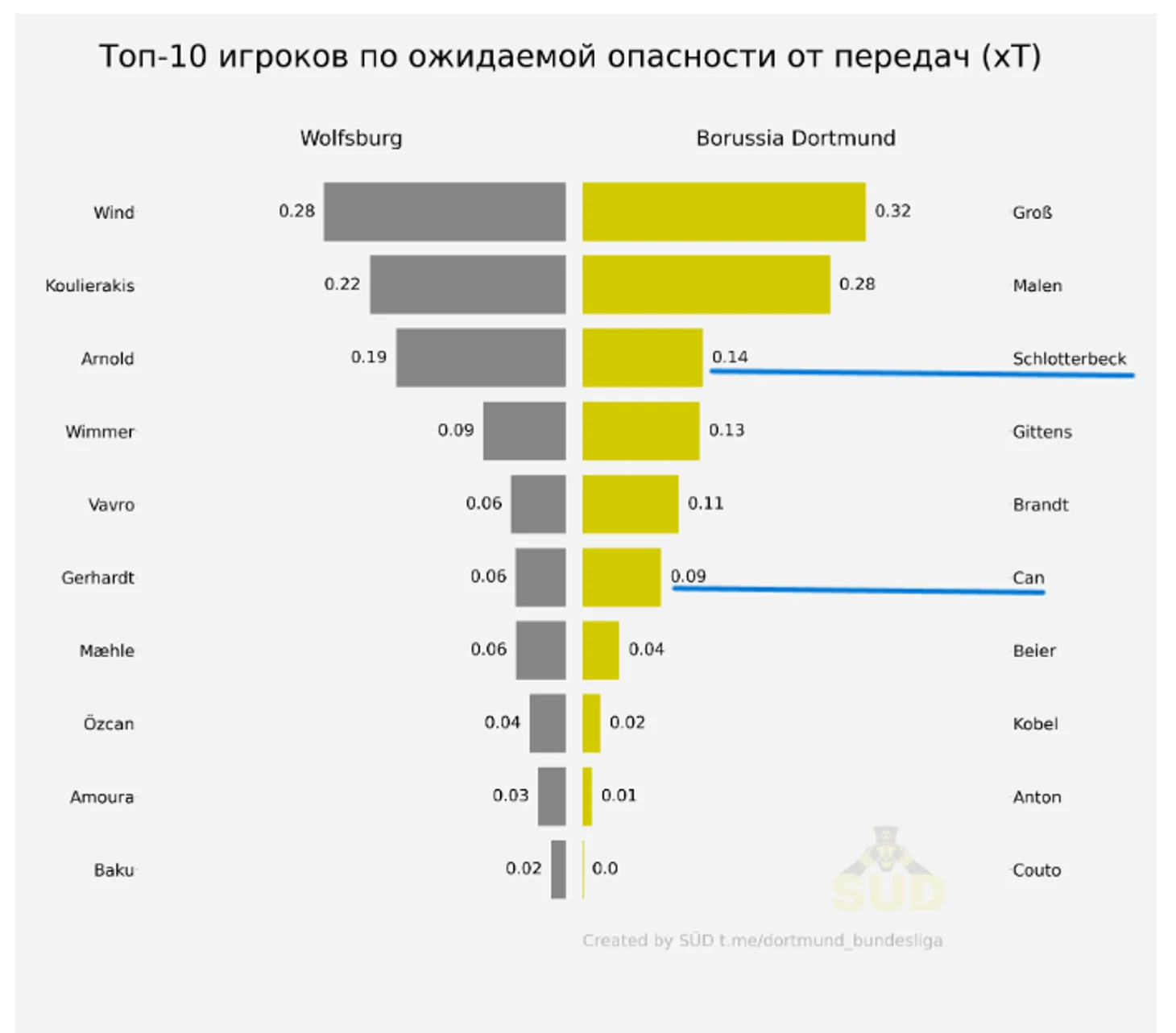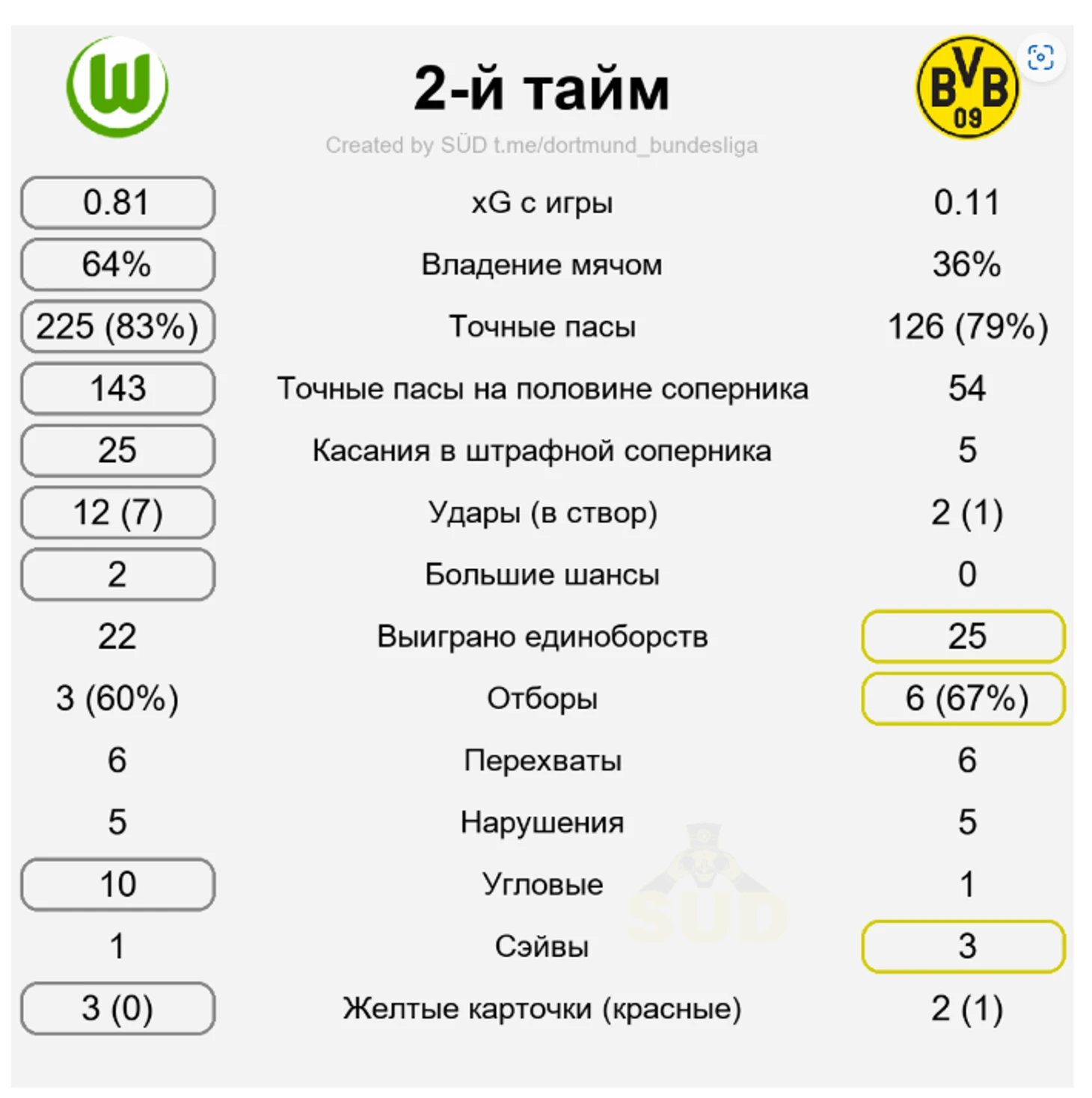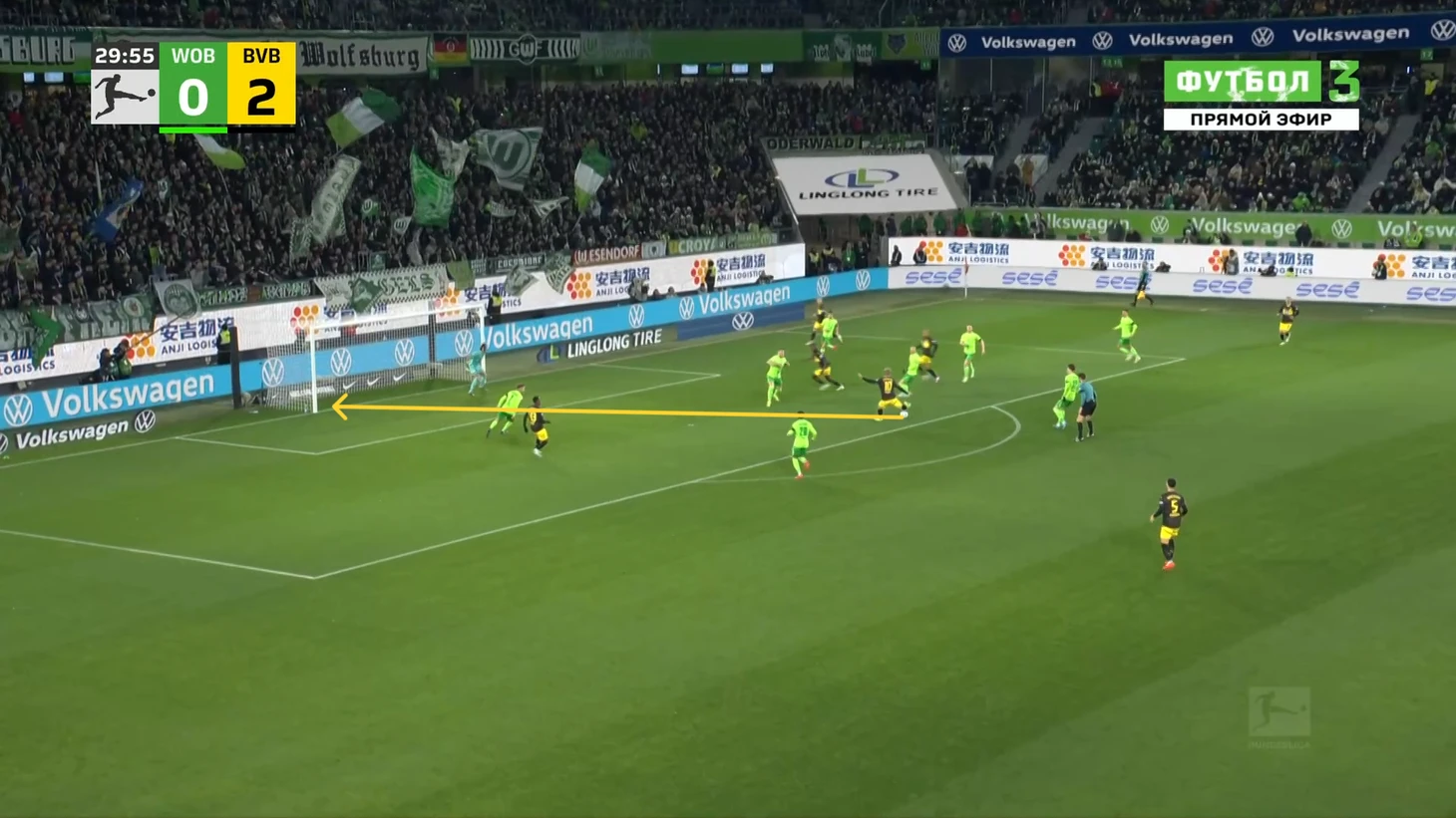 У Эмре ощутимо больше передач, но по точности они даже хуже, чем у Шлоттербека, хотя пасы Нико куда более рискованные, что подтверждает их ожидаемая опасность. Собственно, именно одна из неточных передач Эмре знатно подкосила Дортмунд и заставила его сидеть почти безвылазно сидеть в обороне большую часть второго тайма. Немного скажу и о «Вольфсбурге», ведь с начала казалось, что матч будет максимально равным и сумасшедшим. Ну а какие еще предположения могли возникнуть после вышеописанного начала от «шмелей», а затем и от «волков»? Просто взгляните на это: