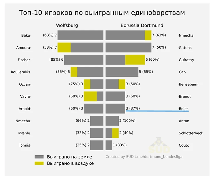 Лично мне в игре без мяча из этих самый двух первых линий больше всего понравился Макси Байер, в первую очередь своей активностью и желанием. Да, однозначно с единоборствами все еще беда, которая сохраняется с самого старта сезона, но в этом направлении, уверен, прогресс скоро придет. Вот, кстати, полная статистика по выигранным единоборствам за матч (она нам еще пригодится):