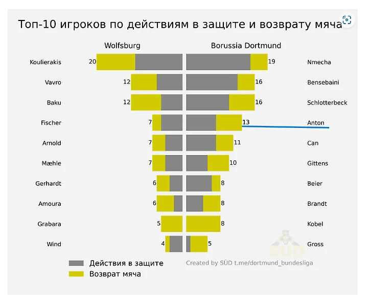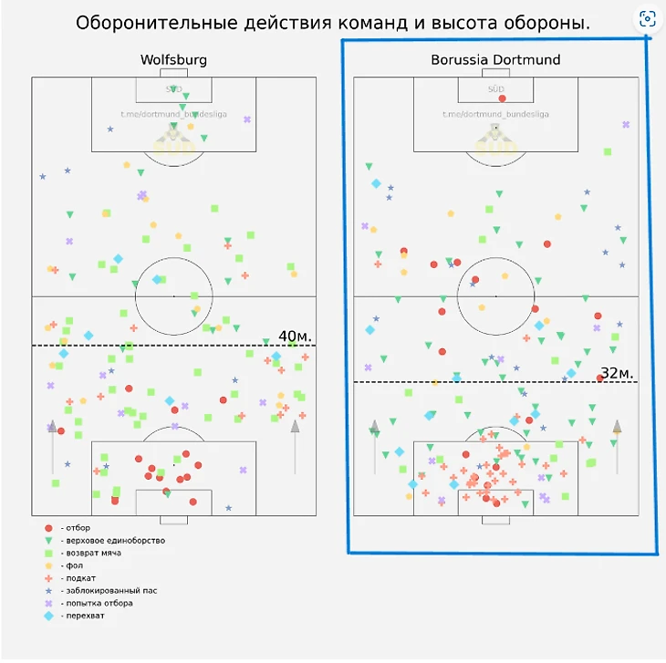 Да, справедливости ради, это карта за весь матч, но за первый тайм у «Вольфсбурга» всего 9 касаний в чужой штрафной, поэтому бОльшая часть действий тут из второго тайма. От себя лишь добавлю того, чего тут нет: за вторую половину дортмундцы заблокировали аж 6 ударов соперника. В особенности на этом отрезке понравился, вышедший в статусе огнетушителя, Антон, ведь несмотря на то, что он вышел еще недолеченным, Вальдемар совершил целых 13 успешных оборонительных действий чуть больше, чем за полчаса. Вот, кстати, полная статистика по этому показателю: