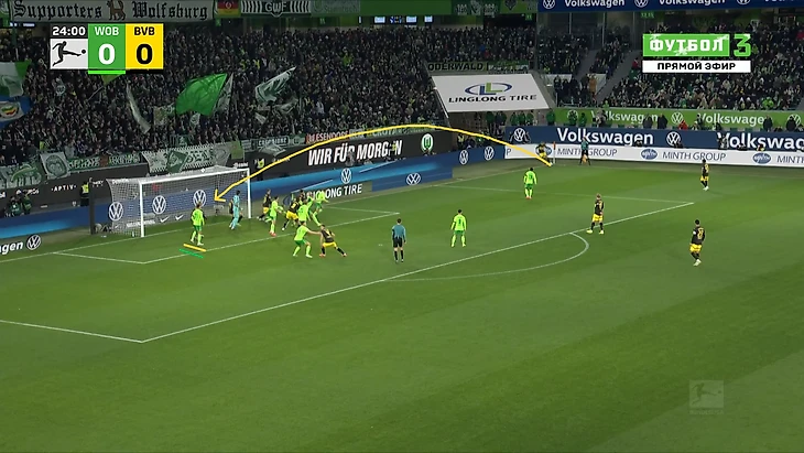 Но главное, конечно, не схема, а появление рискованных действий, ведь за первые 10 минут второго тайма у «Вольфсбурга» столько же ключевых передач, сколько за первые 45. И конечно, это сразу дало результат в виде наиголевейшего момента Лукаса Нмечи: