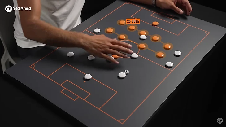 Важная роль была и у опорного полузащитника в лице Джана: контроль темпа и развороты атак, при необходимости с включением голкипера. Также мы задействовали Эмре в построении атак – он «падал» между двумя центральными защитниками, образуя V-образную расстановку.
