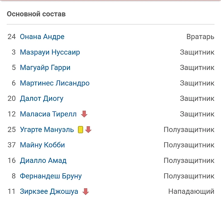 Вот состав на последний матч с «Борнмутом», который они проиграли со счётом 0:3. Сразу бросаются в глаза такие игроки, как Магуайр или Антони, которых я бы продал как можно скорее. Также я бы продал старых игроков и тех, которые просто греют скамью запасных и не играют толком.