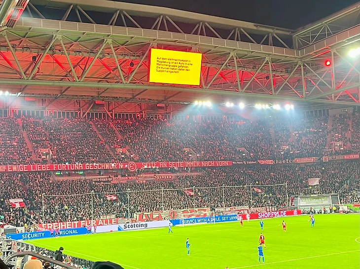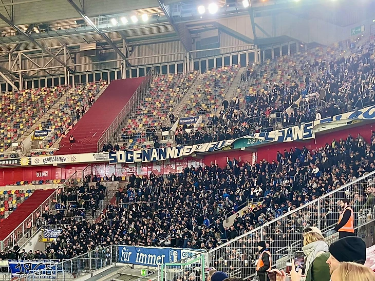 На этот раз место оказалось рядом с гостевым сектором. И если честно, настрой фанатов Магдебурга с самого начала был далек от дружелюбного. Они активно скандировали и не скупились на оскорбления. Полиция была наготове, и в целом обстановка оставалась под контролем.