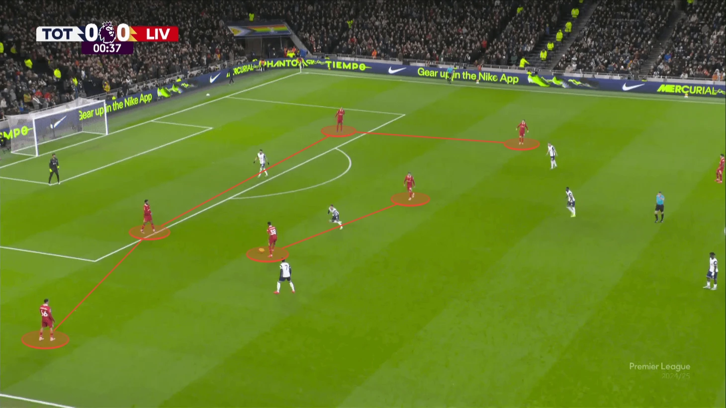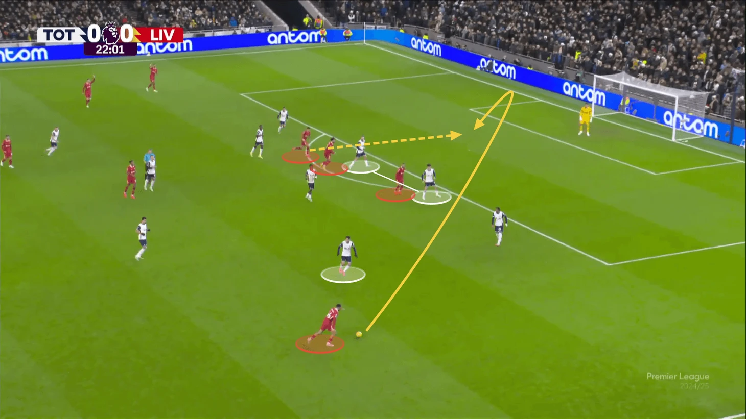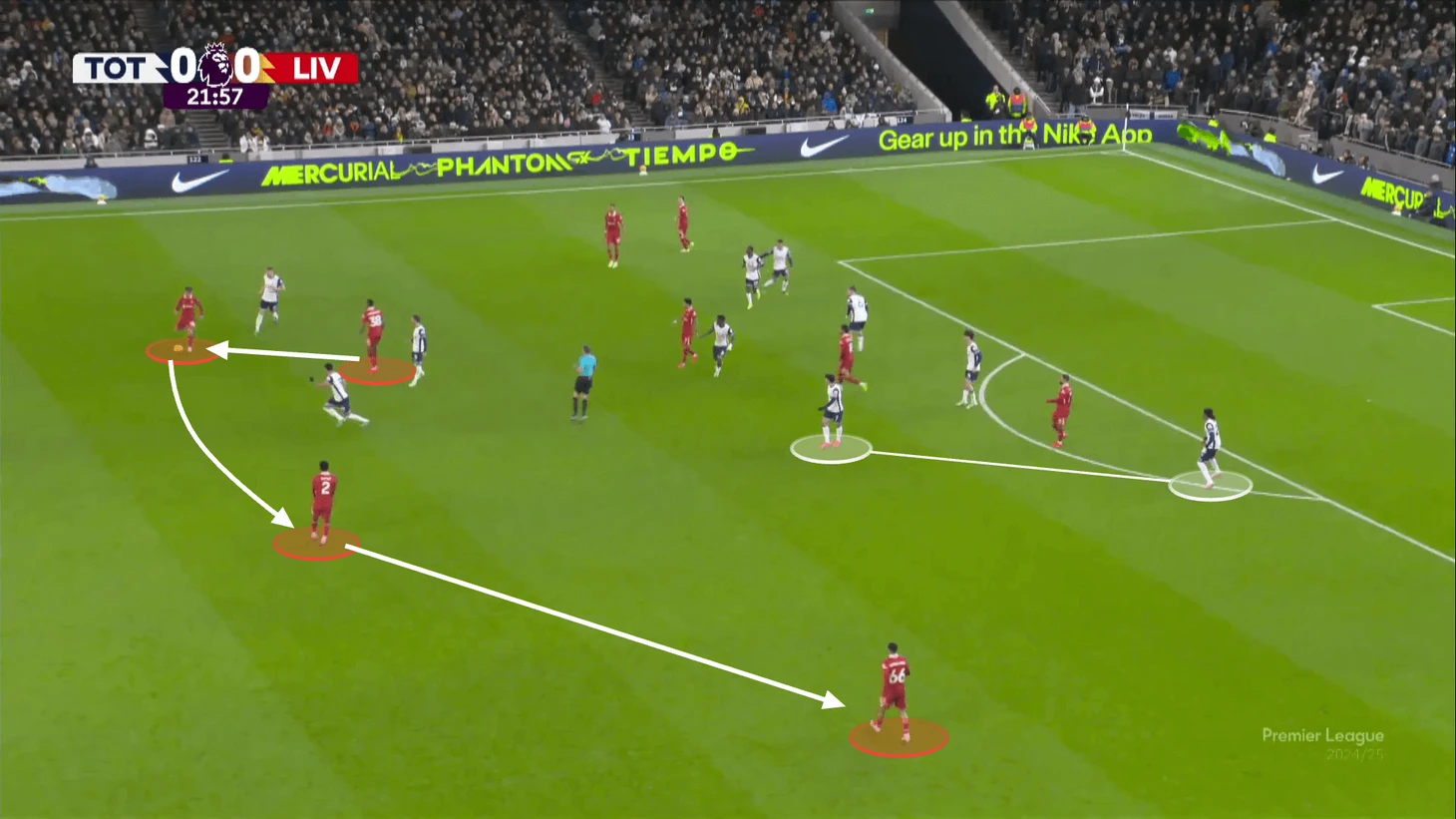 «Шестерки» «Ливерпуля» Алексис Мак Аллистер и Райан Гравенберх должны были больше рисковать в зачинании атак и принимать мяч под давлением, что и привело к первому голу «Тоттенхэма» (когда у Мак Аллистера отняли мяч), но в целом план сработал.