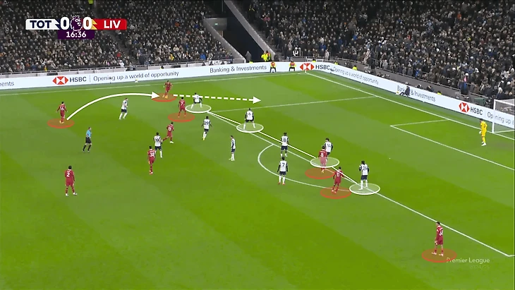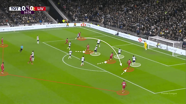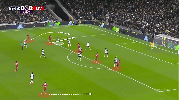 Подобная картина повторилась и при первом голе «Ливерпуля», только с другой стороны, когда они провели атаку с приманкой. Поработав короткими передачами слева и оттянув игроков «Тоттенхэма» на себя, «Ливерпуль» быстро ввел мяч направо во фланг. Таким образом, Сон Хын Мин и Спенс (левофланговые игроки «Тоттенхэма») оказались в слишком узкой позиции, чтобы сразу же оказать давление на Александер-Арнолда.