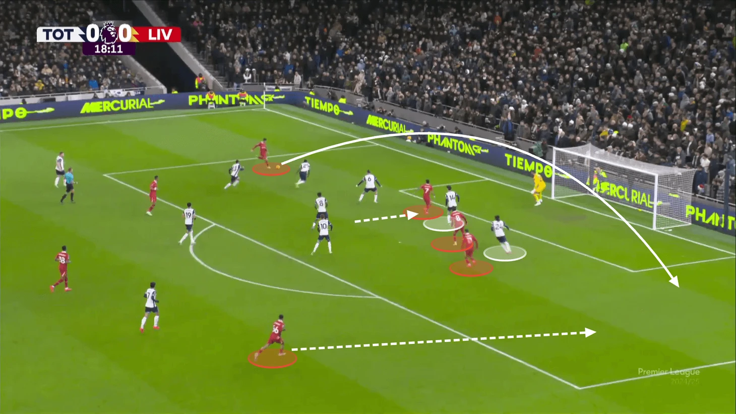 Еще до того, как «Ливерпуль» забил дважды за 13 минут первого тайма, появились тревожные сигналы. Благодаря прямолинейному подходу «Тоттенхэма» мяч часто переходил в полузащиту, и в одном случае «Ливерпуль» вышел вперед, прежде чем хозяева смогли восстановить формацию. Джо Гомес отдает пас Райану Гравенберху, и полузащитник находит выходящего вперед Александер-Арнолда.