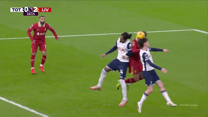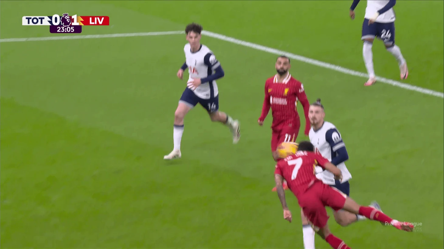 Кросс Гакпо проходит между Алексисом Мак Аллистером и Домиником Собослаи и достигает Салаха. Он наносит два удара в одно касание левой ногой, которые блокирует Джед Спенс, а «Тоттенхэм» спасается, хотя схема успеха была создана.