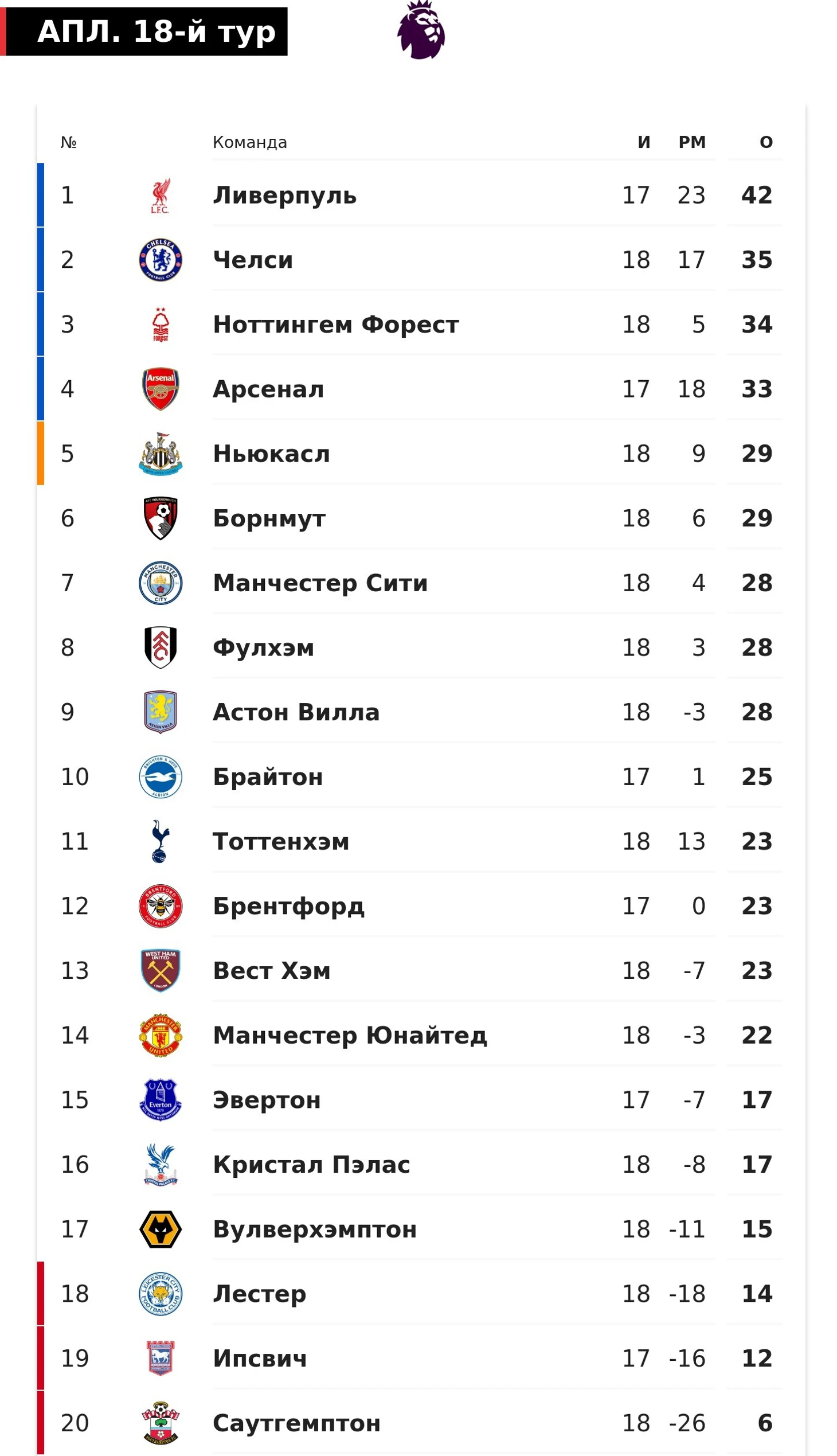 Так выглядит таблица АПЛ без двух матчей 18-го тура и без перенесенной игры «Эвертона» и «Ливерпуля».