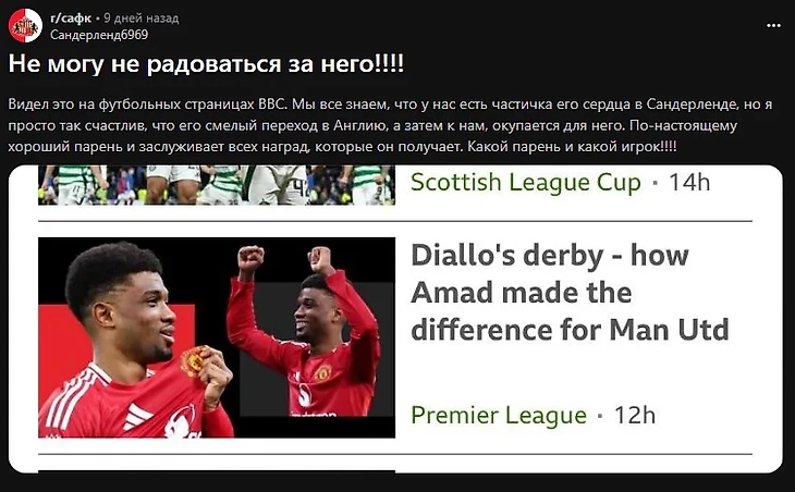 До зимы Амад остался в Италии: доделывал итальянский паспорт, чтобы въехать в Англию уже по европейским документам. Дальше постепенное внедрение в первую команду «МЮ», травмы и аренды: сначала полгода в «Рейнджерс», затем полный сезон-2022/23 в «Сандерленде». Амад почти дотянул команду, только поднявшуюся в Чемпионшип, до АПЛ – в плей-офф споткнулись о «Лутон». Но Амада заслуженно отметили наградой лучшему молодому игроку лиги.