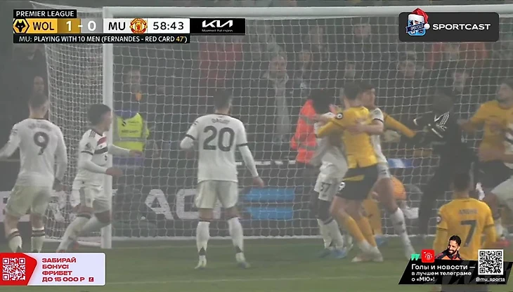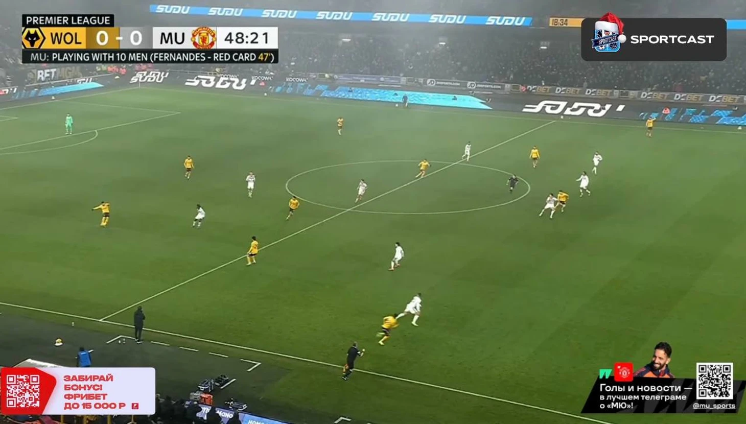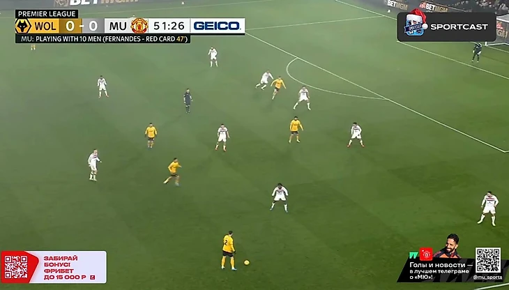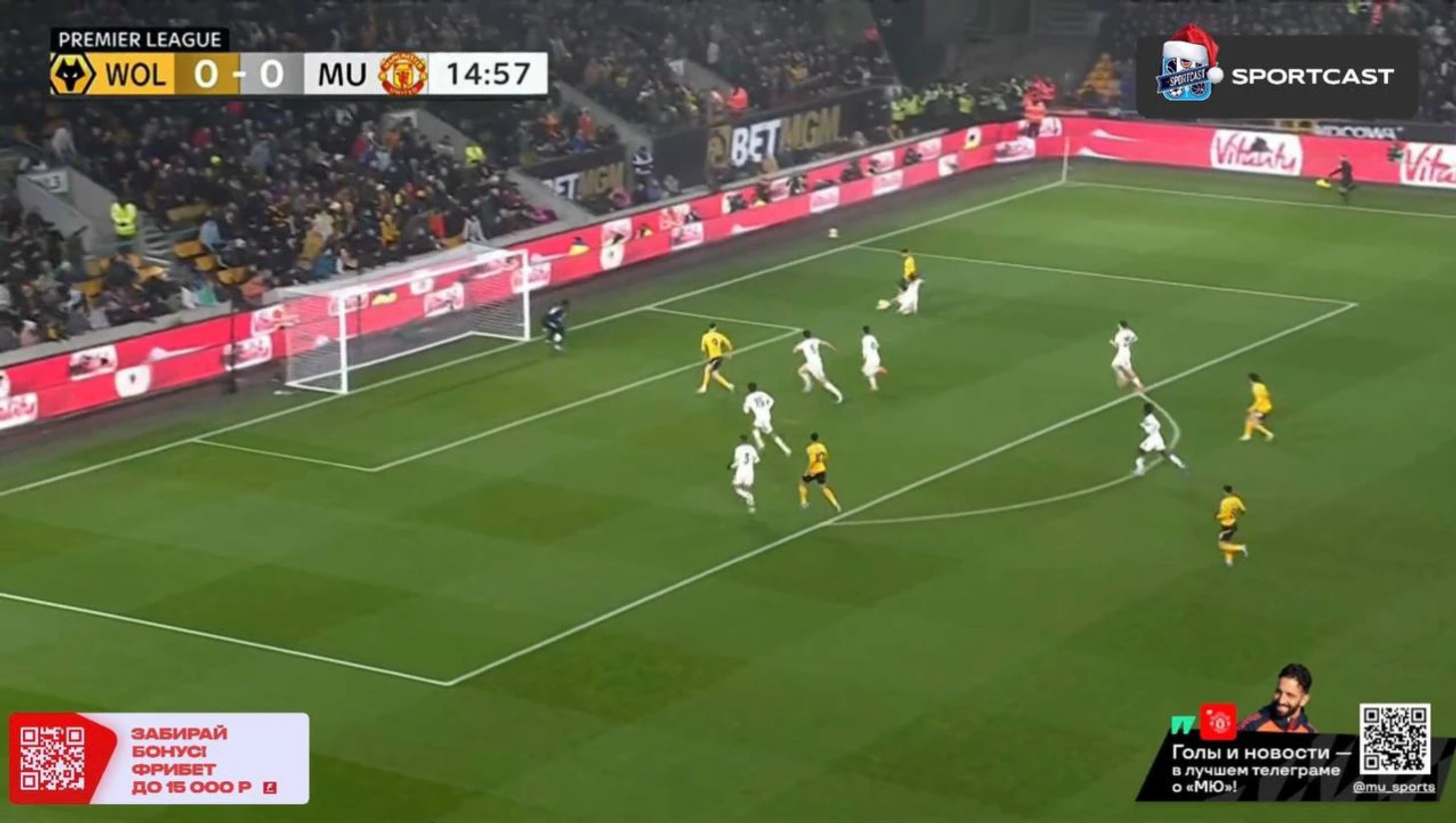 Однако уже через 45 секунд после удаления «Вулвз» чуть не наказали: из-за быстрого перевода мяча с фланга на фланг не успел перестроиться Майну – Лисандро пришлось выйти из линии за 10-й соперника и оголить коридор между собой и Далотом – последовал заброс и вход в штрафную. Повезло, что Странд Ларсен заступил на 30 сантиметров и сам себя загнал в оффсайд.