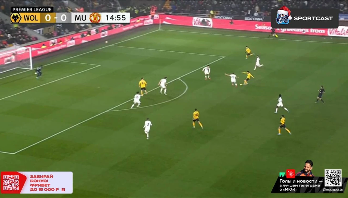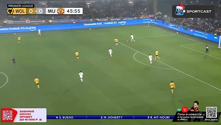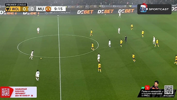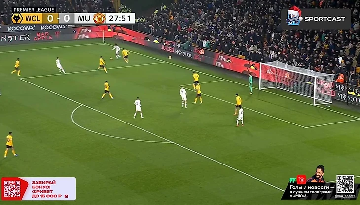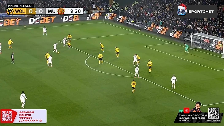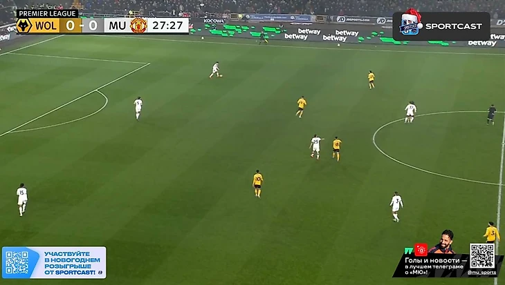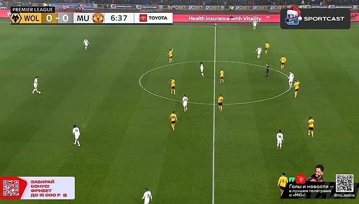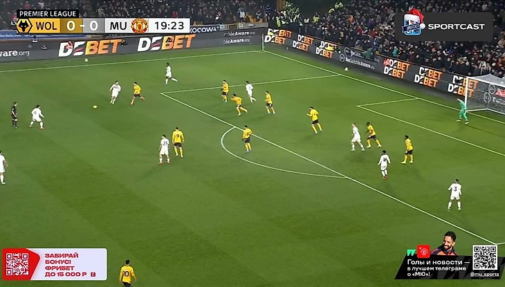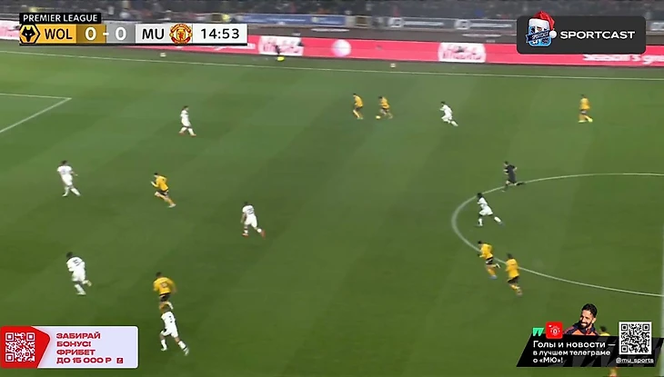 Первый тайм получился весьма вязким – относительно острые позиционные атаки «Юнайтед» сменялись контратакующими выпадами «волков» и иногда разбивались стандартными положениями. В преодолении прессинга снова подмечаем роли фуллбэков и нападающего, умеющего ставить корпус: на примере ниже выход через Нуссаира с передачей на третьего Расмусу.