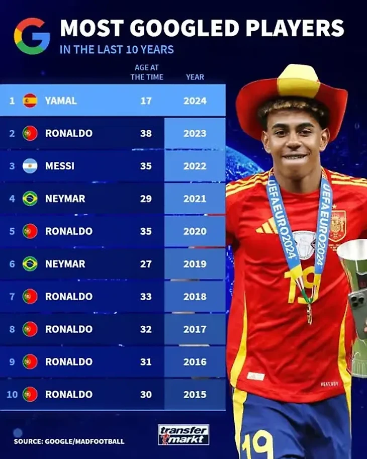 Неймар и Месси периодически выходят на первое место, но есть ощущение, что никто из них уже не станет первым. Вспышка Ламина Ямаля в 2024 году знаменует начало новой эпохи. В 17 лет он уже привлекает внимание всего мира, доказывая, что молодые таланты могут быстро стать звездами.