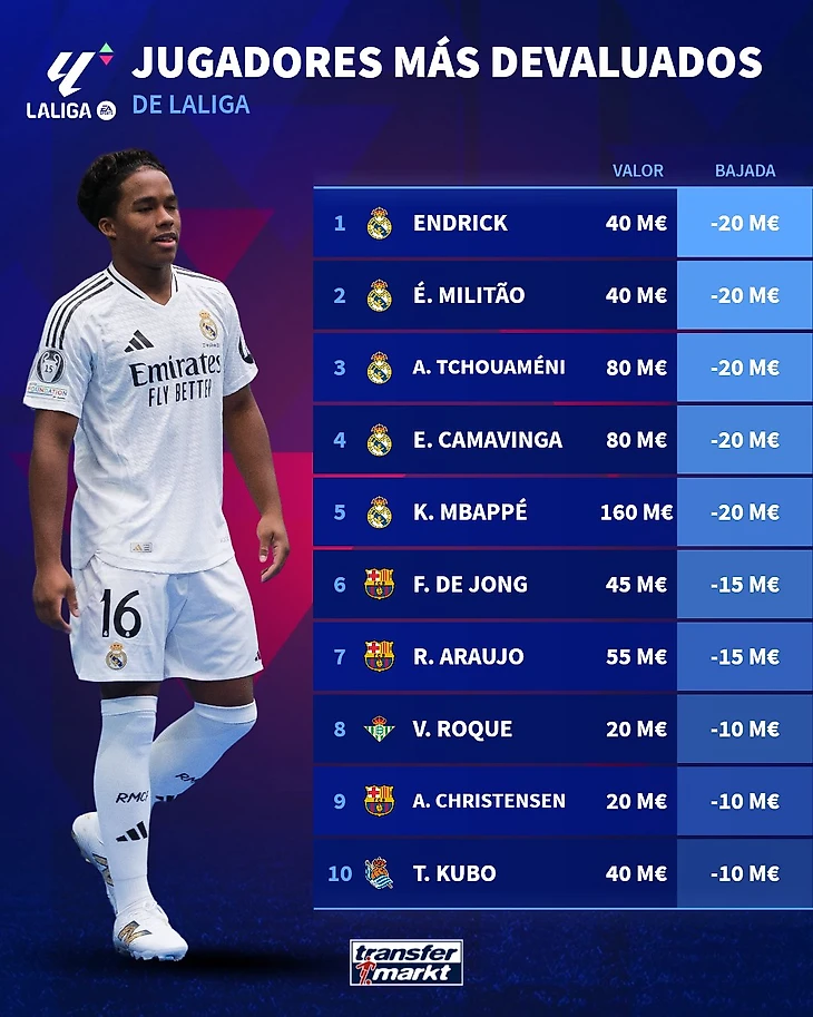 Состав «Мадрида», напротив, упал в цене. Помимо Мбаппе трансферная стоимость еще четырех игроков понизилась на 20 млн евро: Орельен Тчуамени, Эдуардо Камавинга, Эдер Милитао и Эндрик. В топ-10 футболистов с наибольшим снижением рыночной стоимости вошли пять представителей «королевского клуба».