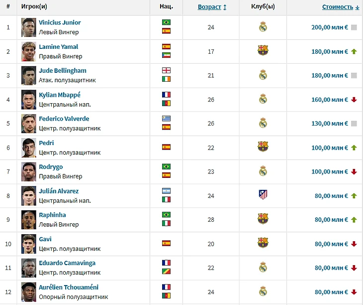 Статистический портал Transfermarkt под занавес 2024 года провел декабрьское обновление трансферных цен игроков Ла Лиги.
