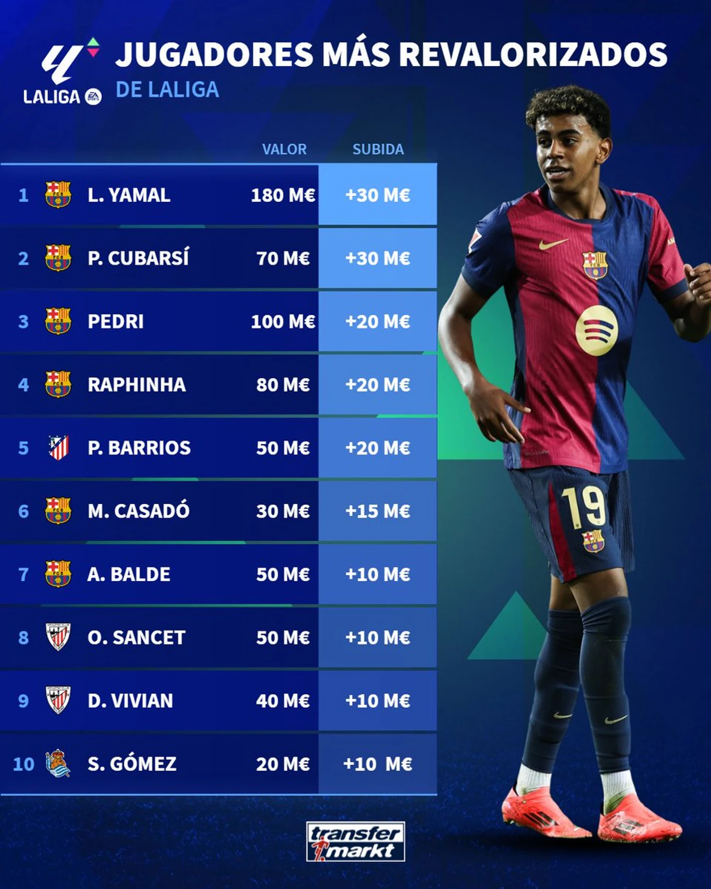 Самые крупные скачки в рыночной стоимости совершили 17-летние таланты «Барселоны» Пау Кубарси и Ламин Ямаль – оба стали дороже на 30 млн евро. Ламин стал самым молодым игроком в истории сбора информации Transfermarkt, чья стоимость преодолела отметку в 180 млн евро!