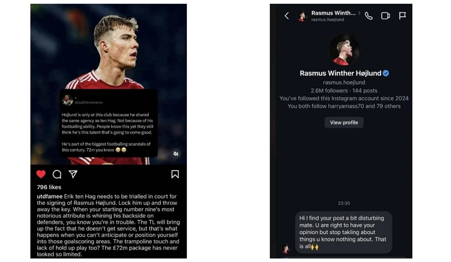Фанат «МЮ» раскритиковал Хейлунда в соцсетях. Расмус нашел пост и вот что он ответил болельщику в личку