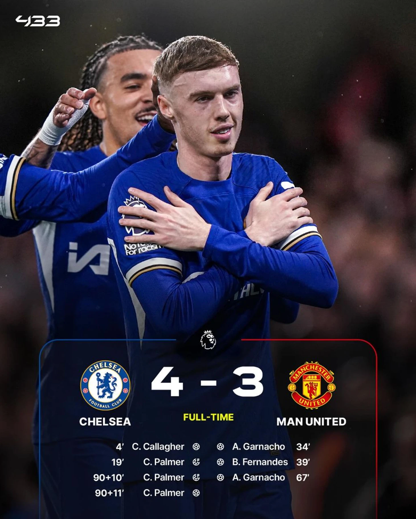 Игра в начале апреля 2024-го началась в пользу «синих» – 2:0 к 19-ой минуте. Правда к концу первого тайма «Юнайтед» сравнял счёт, а на 67-ой минуте уже был впереди. Всё шло к победе «красных дьяволов», но на 90+10-ой «Челси» заработал пенальти, который реализовал Палмер. Примерно через минуту «синие» быстро разыграли угловой и Коул оформил свой первый хет-трик за «Челси» – 4:3!
