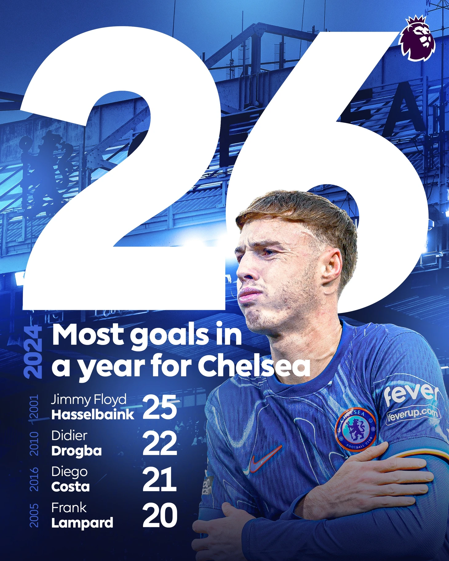 Коул Палмер забил 26 голов в АПЛ в 2024-ом году – рекорд за календарный год среди всех игроков «Челси» в истории.