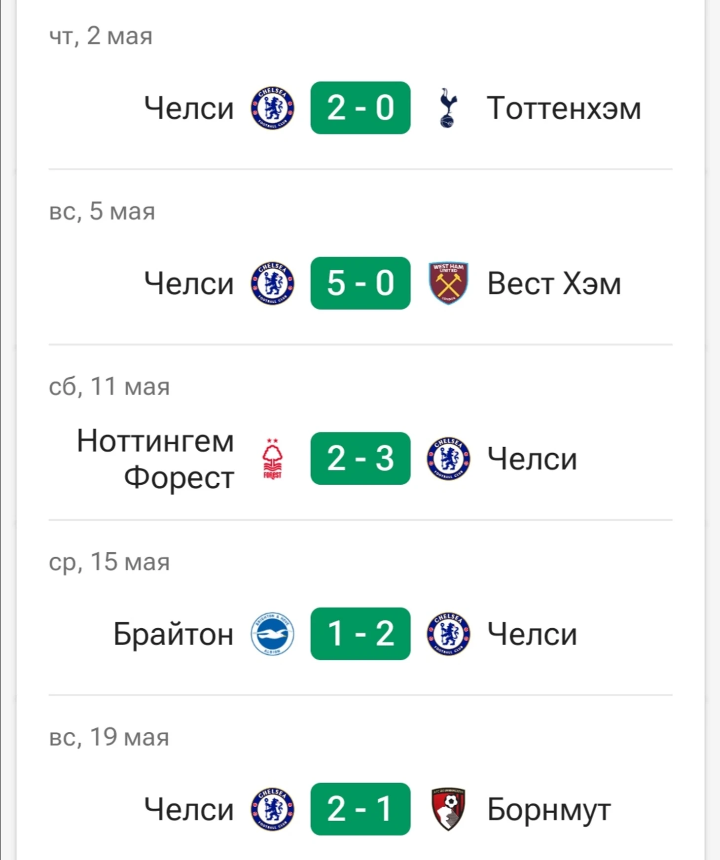В мае «Челси» совершил рывок из 5-ти побед подряд. Во многом это связано с тем, что Почеттино пришёл к тому, что Кукурелья стал инвертироваться в центр поля, а парни к концу сезона обрели «химию» и показали желание занять место в таблице повыше.