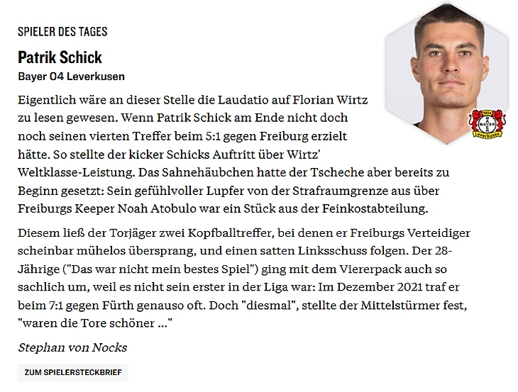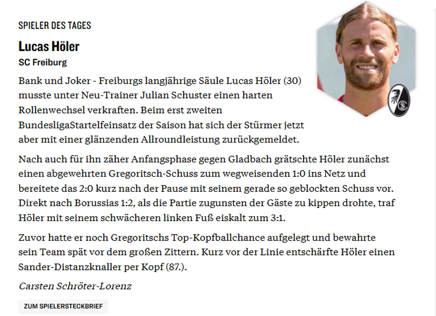 «Удивительно, что этот мальчишка делает на поле. Как соперника, меня это сегодня, само собой, бесит до предела. Но этот парень потрясающий, благословение для футбольной Германии», – так высказался в послематчевом интервью о Флориане капитан «Фрайбурга» Кристиан Гюнтер,
