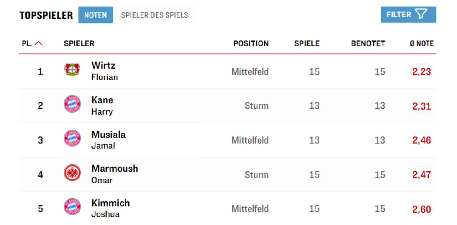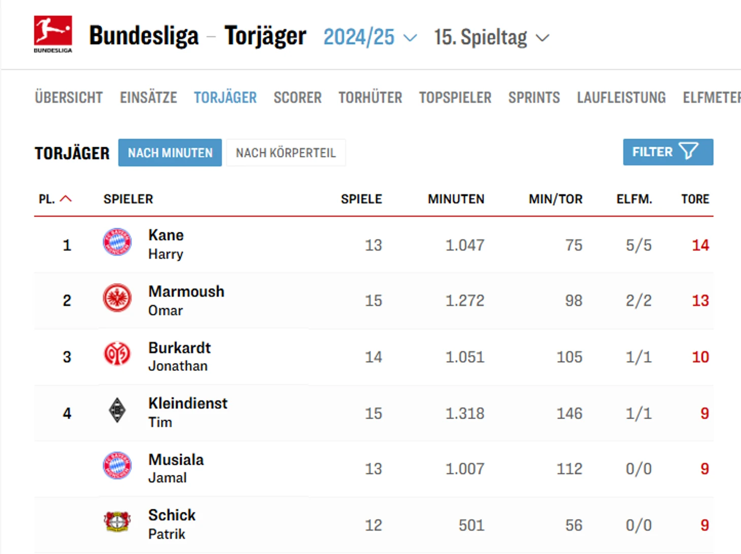 ● Whoscored составил сборную Бундеслиги-2024. В состав вошли: – вратарь: Фредерик Реннов («Унион», средняя оценка – 6,9); – защита: Йозуа Киммих («Бавария», 7,25), Вилли Орбан («Лейпциг», 6,96), Нико Шлоттербек («Боруссия» Дортмунд, 7,04), Алехандро Гримальдо («Байер», 7,41); – полузащита: Флориан Виртц («Байер», 7,61), Хави Симонс («Лейпциг», 7,63), Джамал Мусиала («Бавария», 7,86); – нападение: Омар Мармуш («Айнтрахт», 7,62), Харри Кейн («Бавария», 7,74), Серу Гирасси («Боруссия» Дортмунд, 7,39).