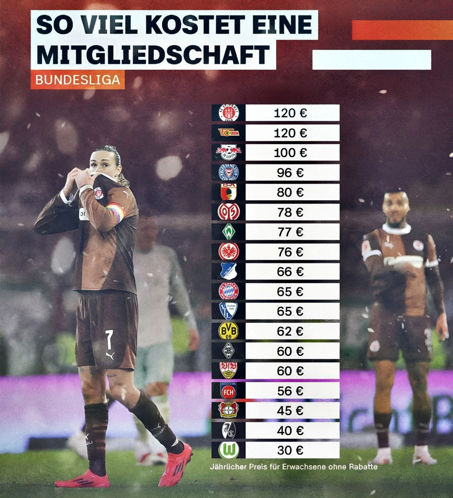 «Санкт-Паули» разделил с «Унионом» первое место в списке клубов с самым дорогим членством в Бундеслиге, за год членам клубов придется заплатить 120 евро.