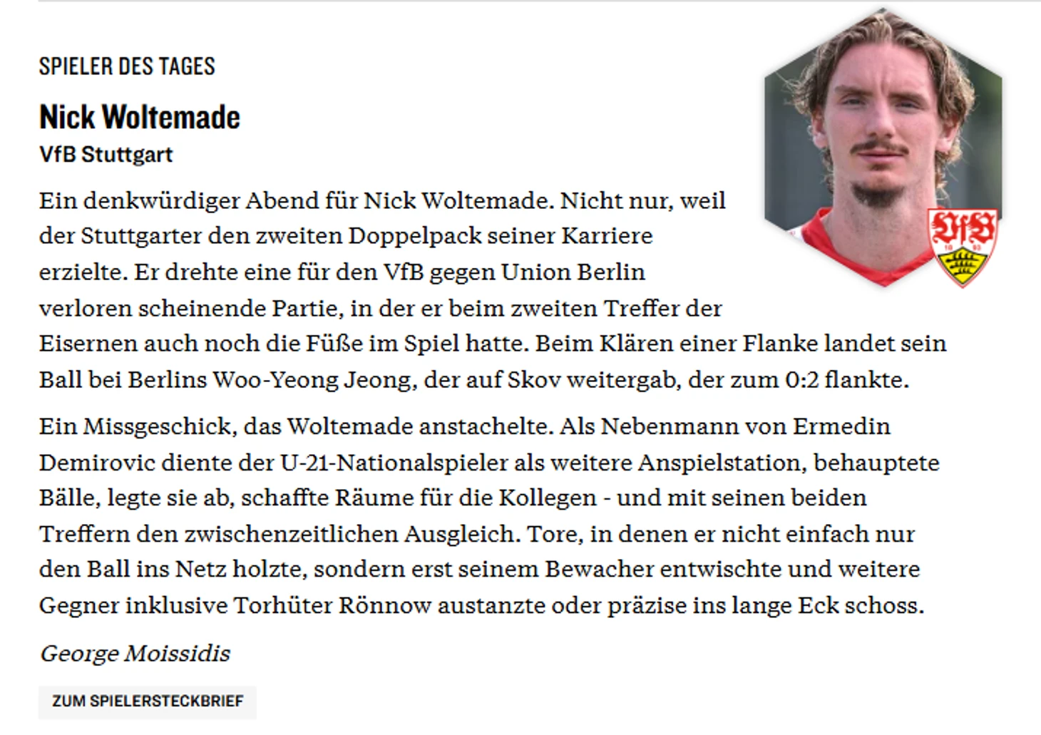 «Штутгарт» продолжает держать марку, но и не без досадных проигрышей проводил декабрь. Сначала заработал балл с «Вердером» (2:2). По итогу команда взяла очки уже пятый раз подряд в этом сезоне, что чаще, чем в прошлом году. В 13-м и 14-м турах «Штутгарт» одерживал победы над «Унионом» (3:2) и «Хайденхаймом» (1:3). Причем в матче со столичной командой клуб умудрился три гола забить в течение 18-ти минут, и дважды голы праздновал Вольтемаде. Кстати, Ник отметился и в следующем матче голом.