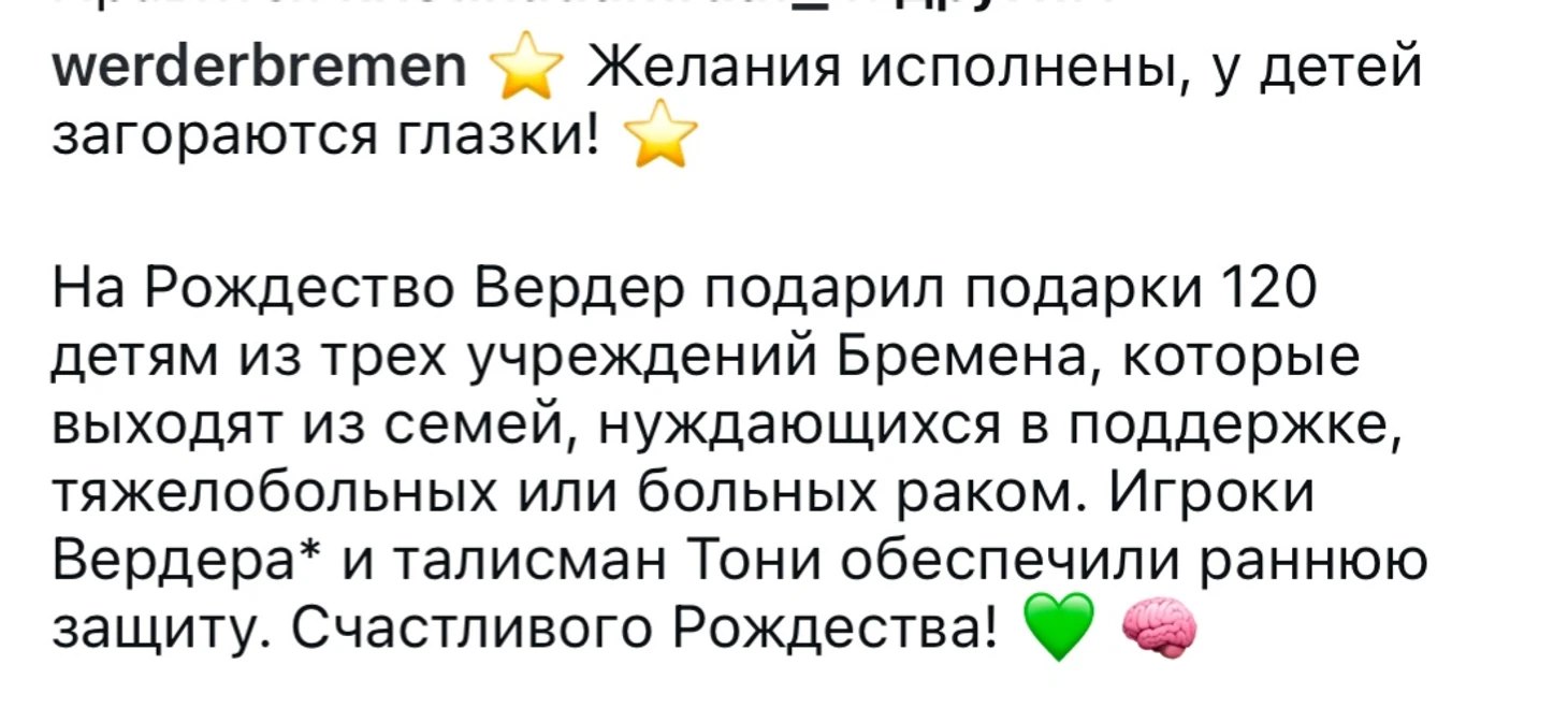 Из интересного: после успешной серии и ухода на зимний перерыв, игроки «Вердера» сделали подарки на Рождество для детей из медицинских учреждений, которые являются тяжелобольными и нуждаются в поддержке.