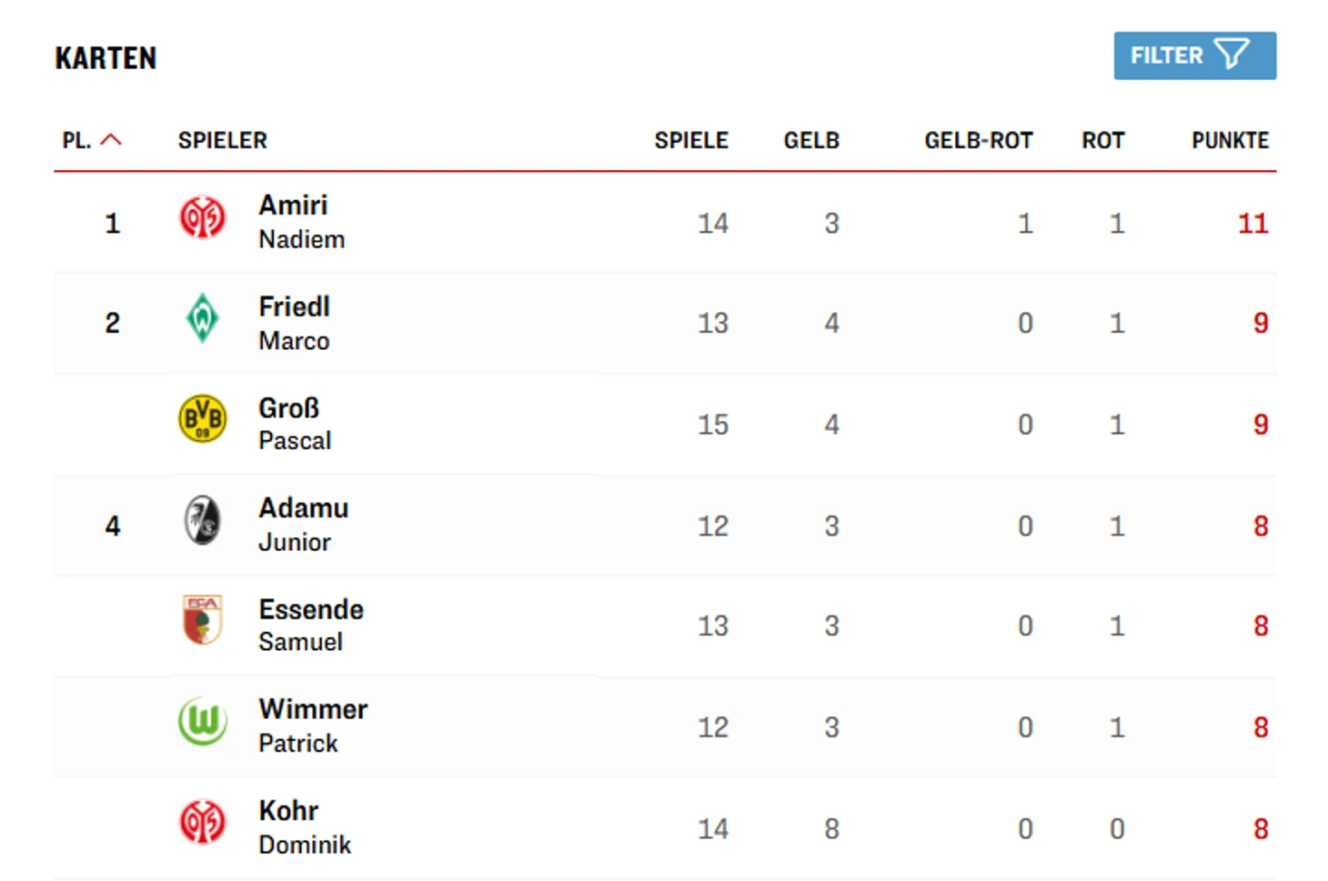 *игрок – кол-во игр – желтые – 1+1 желтые – красные – всего