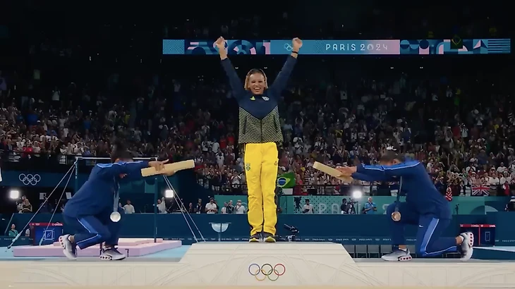 14. Гимнастка Ребека Андраде – олимпийская чемпионка в опорном прыжке из Бразилии, ей на пьедестале поклоняются Симона Байлс и Джордан Чайлз.
